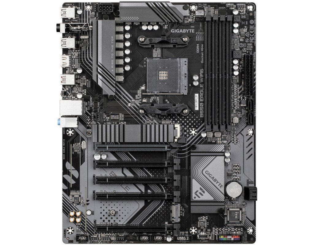 Gigabyte B550 EAGLE WIFI6 — материнська плата формфактора ATX, призначена для встановлення процесорів AMD, які сумісні із сокетом B550. Підтримує оперативну пам'ять DDR4, для планок передбачено 4 слоти з можливістю встановлення до 128 ГБ. Має всі необхідні роз'єми для встановлення накопичувачів швидкісного типу, відеопорти для підключення мультимедійних пристроїв. Для надійного та швидкого з'єднання материнська плата передбачає підтримку Wi-Fi 6, що забезпечує швидкий обмін даними, безперебійну потокову передачу та значні переваги у сфері віртуальної реальності завдяки високій пропускній здатності та низькій затримці. Рішення GbE LAN забезпечує неймовірно високу швидкість передачі даних, щоб гарантувати стабільне середовище передачі даних, коли система виконує хмарні обчислення або надає зовнішні обчислювальні послуги. Наявні якісні аудіоконденсатори допомагають забезпечити високу роздільну здатність і точність звуку, щоб ви отримали найбільш реалістичні звукові ефекти. А також є система захисту від звукових шумів, яка фактично відокремлює чутливі аналогові аудіокомпоненти плати від потенційного шумового забруднення на рівні друкованої плати. Особливості: - AMD Socket AM4: підтримує процесори AMD Ryzen серії 5000 / 4000 / 3000; |
