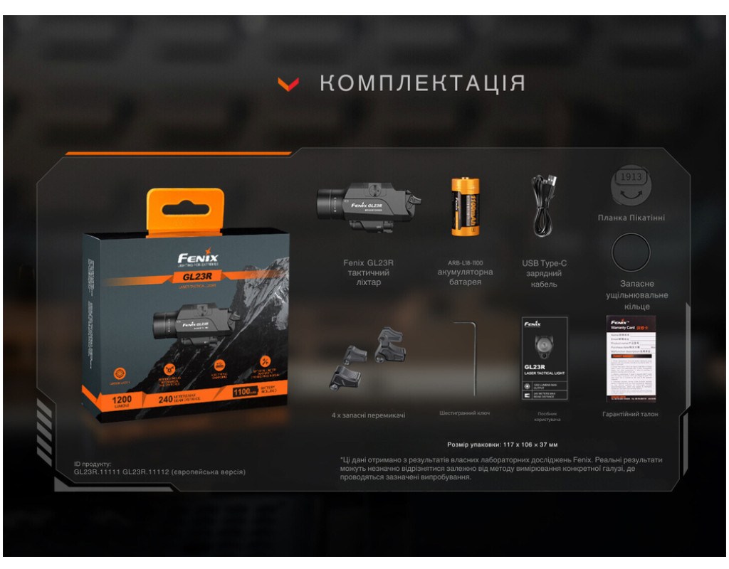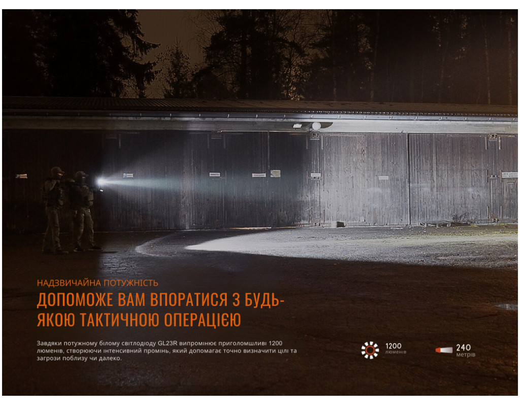 | Ліхтар Fenix GL23R з лазерним прицілом (GL23R) — це універсальний та надійний інструмент, створений для професіоналів і аматорів, які цінують якість та функціональність. Цей підствольний ліхтар спеціально розроблений для підвищення точності та ефективності при виконанні службових або тактичних завдань. Завдяки компактним розмірам всього 87 мм і вазі лише 120 г, він легко встановлюється на більшість повнорозмірних пістолетів з планками Glock або Mil-std-1913 (Пікатінні), що значно розширює можливості його використання. Серцем Fenix GL23R є LED-джерело Luminus SFT40, яке генерує надзвичайно яскравий холодний білий промінь потужністю 1200 люмен. Він здатний освітлювати на відстань до 240 метрів, що робить цей ліхтар ідеальним рішенням для роботи в умовах обмеженої видимості або вночі. Зелений лазер, з хвилею 520 нм, надає точний цілевказівник, поліпшуючи точність стрільби. Перехід між режимами, такими як біле світло, зелений лазер або комбінований режим, здійснюється швидко і зручно за допомогою нижнього обертового перемикача та перемикачів в задній частині корпусу. Функціональність ліхтаря підтримується вбудованим акумулятором ємністю 1100 мАг, який гарантує стабільну роботу пристрою на тривалий час. Зарядка здійснюється через USB Type-C порт, що забезпечує швидкість та зручність в процесі відновлення заряду. Порт захищає резинова заглушка, що оберігає від вологи та пилу. Додаткову зручність забезпечує індикатор заряду, що змінює колір з червоного на зелений після повного заряджання. Матеріал корпуса — це міцний алюміній A6061-T6 з анодуванням типу III, який захистить ліхтар від фізичних пошкоджень при падінні з висоти до 1 метра. Вологонепроникність та захист від пилу класу IP66 гарантує надійну роботу під дощем та в умовах високої вологості. Ліхтар постачається з комплектом з чотирьох змінних перемикачів, які дозволяють налаштувати керування відповідно до ваших потреб, та ущільнювальним кільцем для додаткового захисту. Крім того, конструкція передбачає ключ та кріплення на планку Glock, які розширюють можливості встановлення та використання. Режими роботи ліхтаря наступні: - Білий: 1200 лм – 1 година – 240 м; - Зелений лазер: 520 нм; - Комбінований режим (біле світло + зелений лазер): 1200 лм + 520 нм – 1 година – 240 м. Цей ліхтар є втіленням бездоганної якості та інноваційних технологій, що гарантують відмінну продуктивність у будь-якій ситуації. Якщо вам потрібна надійність, висока яскравість та лазерна точність в одному пристрої, Fenix GL23R — ваш ідеальний вибір. |