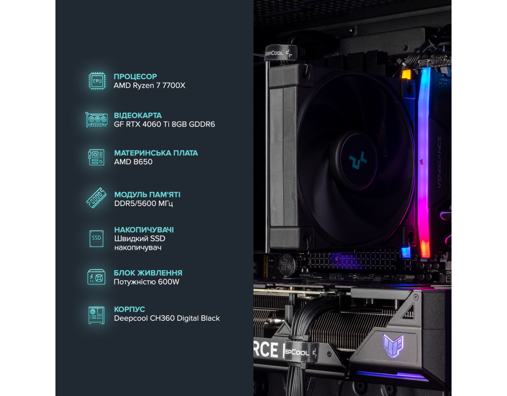 Персональний комп`ютер ASGARD (A77X.32.S10.46T.5208); AMD Ryzen 7 7700X (4.5 - 5.4 ГГц) / ОЗП 32 ГБ / SSD 1 ТБ / NVIDIA GeForce RTX 4060 Ti 8 ГБ / без ОП / LAN / Ubuntu / чорний