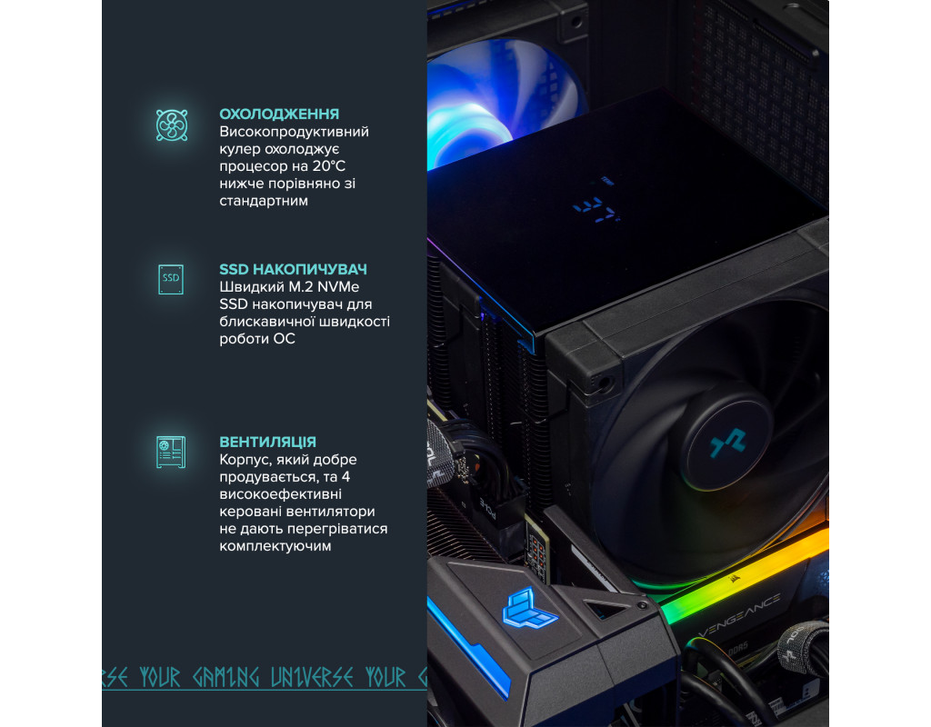 Геймер створює свій персоналізований, ігровий простір, де кожна деталь має особливе значення. Друк ваших улюблених героїв на корпусі, комплектуючі кращих виробників світу, безліч варіантів підсвітки - все це створить неймовірну атмосферу і ще більше занурить вас у світ гри.