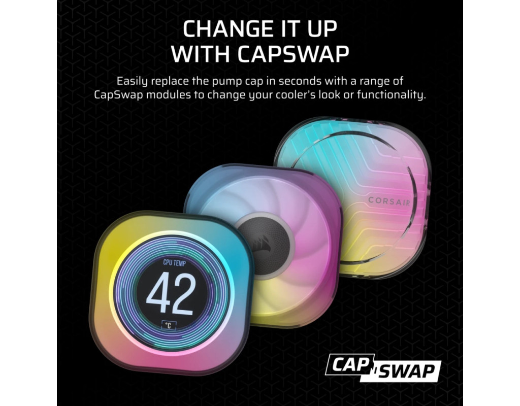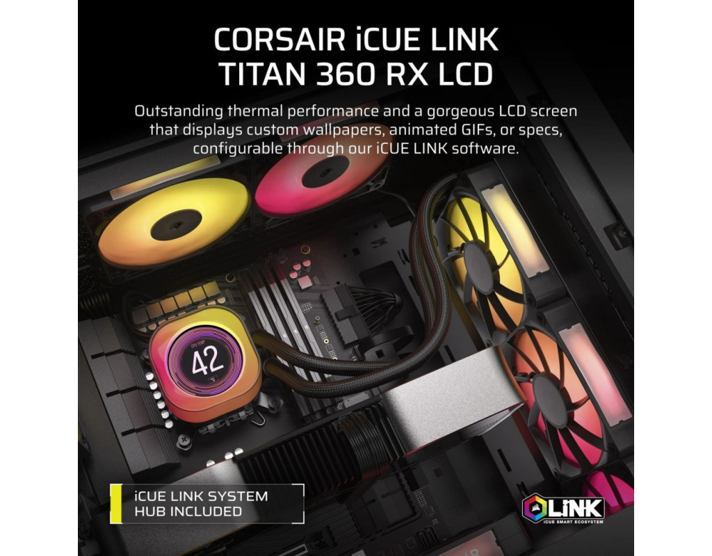 CORSAIR iCUE LINK TITAN RX LCD забезпечує високопродуктивне, ультратихе охолодження з оптимізованими тепловими характеристиками, спрощеним підключенням iCUE LINK та динамічним RGB-підсвічуванням.