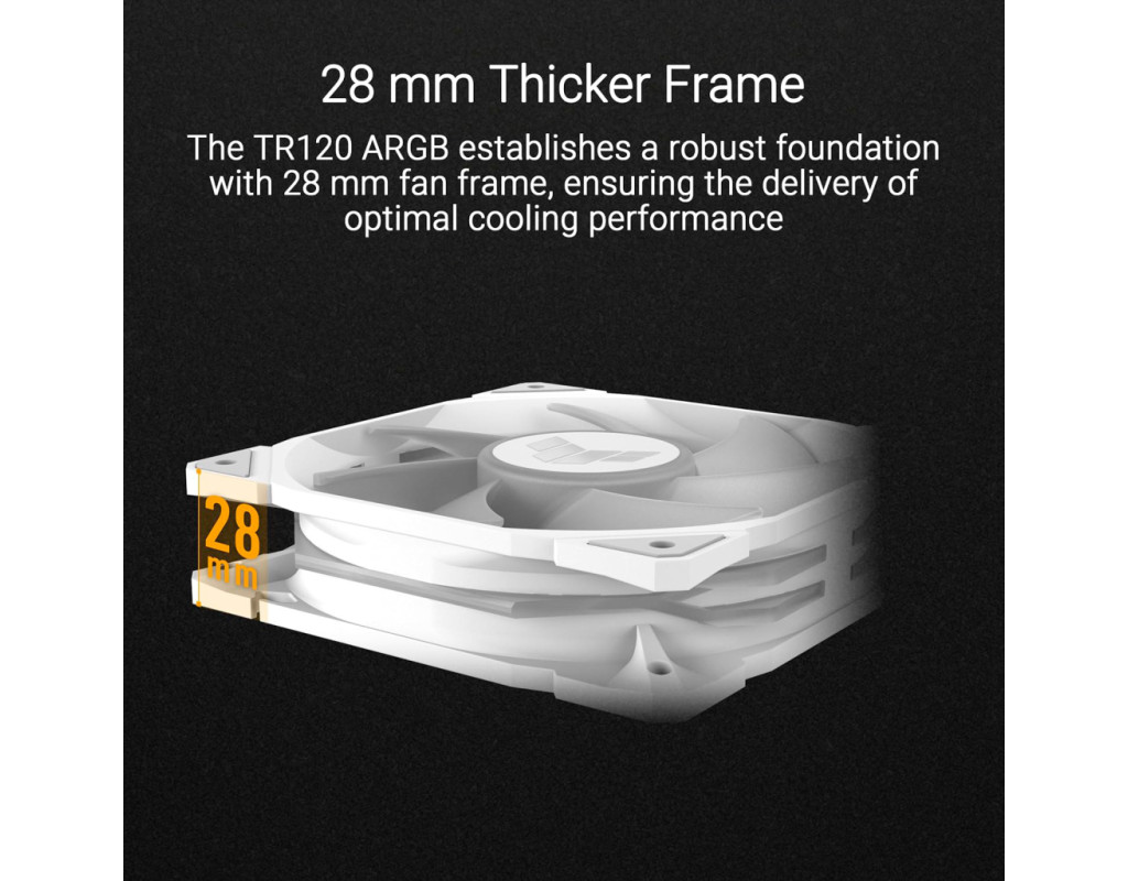 • Потовщена рама для підвищення продуктивності. Завдяки надтовстій 28-мм рамці вентилятора корпусний вентилятор TUF Gaming TR120 ARGB створює надійну основу, що забезпечує оптимальну продуктивність охолодження