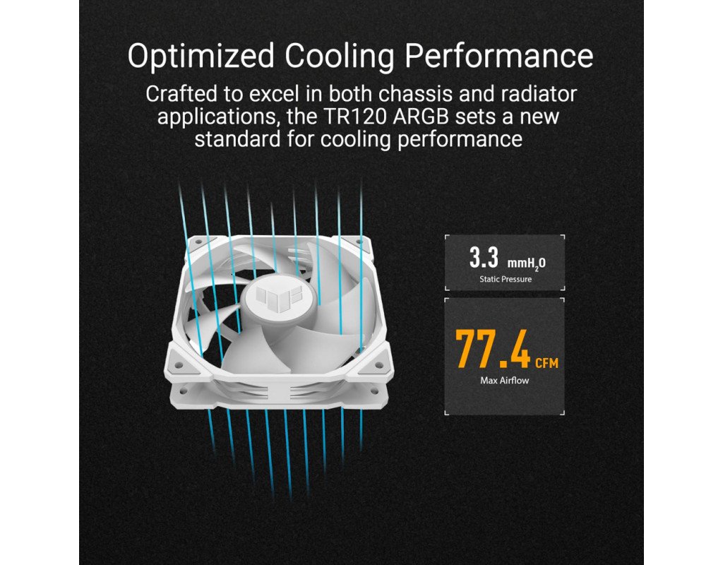 • Оптимізована продуктивність охолодження. Корпус TUF Gaming TR120 ARGB ретельно оптимізовано, він може похвалитися вражаючим статичним тиском 3,3 мм H2O і найкращим у своєму класі повітряним потоком 77,4 CFM. Створений для використання як у корпусі, так і в радіаторі, він встановлює новий стандарт продуктивності охолодження