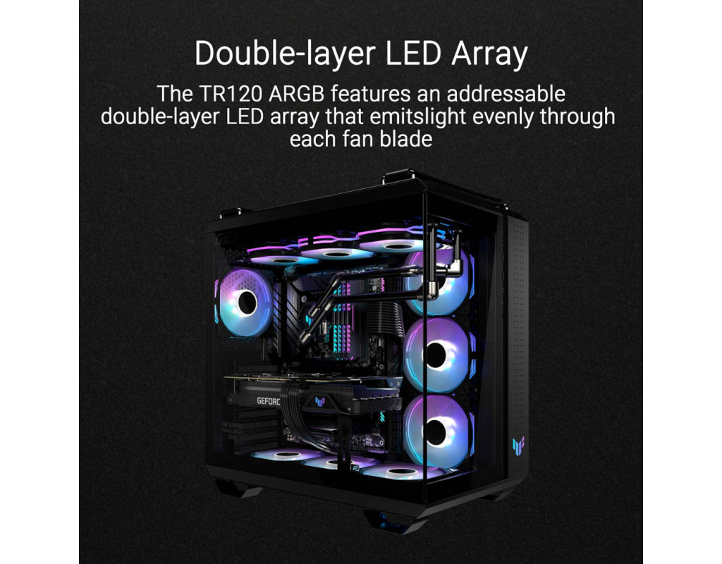• Двошаровий світлодіодний масив. TR120 оснащений адресованою двошаровою світлодіодною матрицею, яка рівномірно випромінює світло через кожну лопать вентилятора, внаслідок чого звичайні RGB-вентилятори мають розмитий вигляд