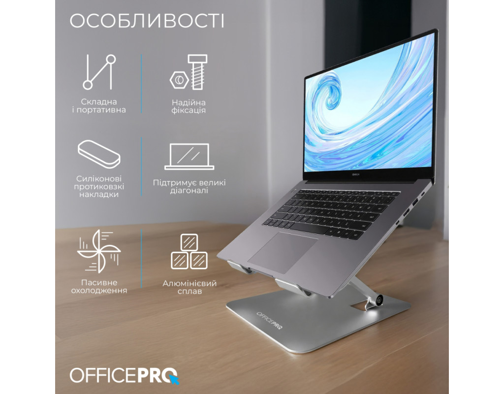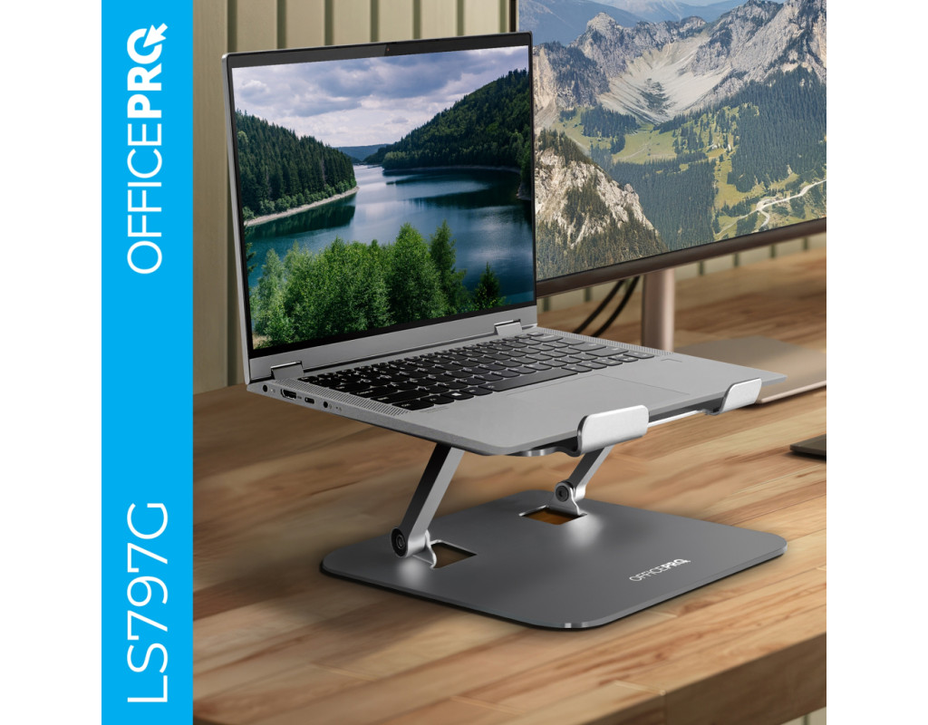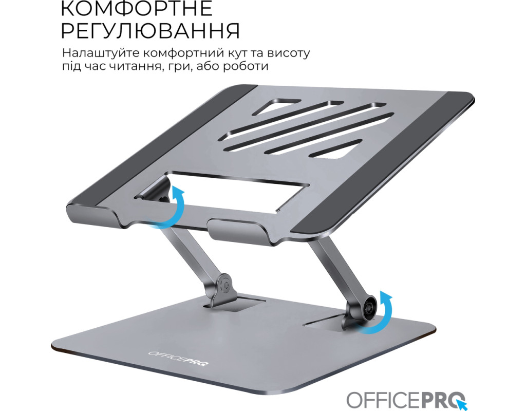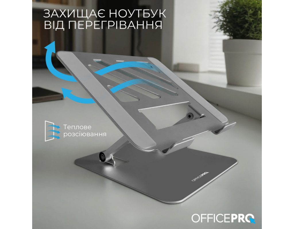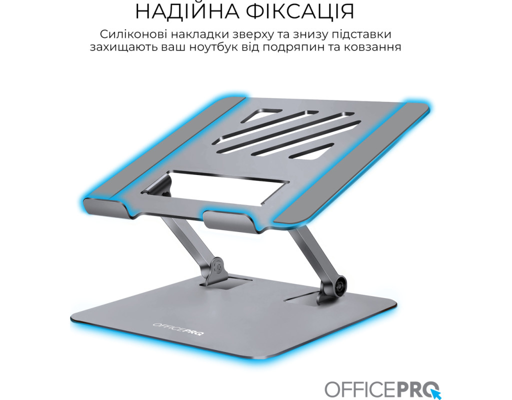 Оптимізуйте вашу робочу ефективність та комфорт з підставкою для ноутбука OfficePro LS797G, що поєднує мінімалістичний дизайн із зручністю використання. Завдяки регулюванню висоти та кута нахилу верхньої пластини, користувач може зручно налаштувати положення ноутбука для оптимального перегляду і комфортної роботи. Підставка виготовлена з надійного алюмінієвого сплаву, що забезпечує стійкість, легкість та довговічність використання, а також покращує теплообмін. Силіконові антиковзкі накладки на основі підставки та на опорній поверхні допомагають уникнути ковзання ноутбука та забезпечують його надійну фіксацію. Особливості: