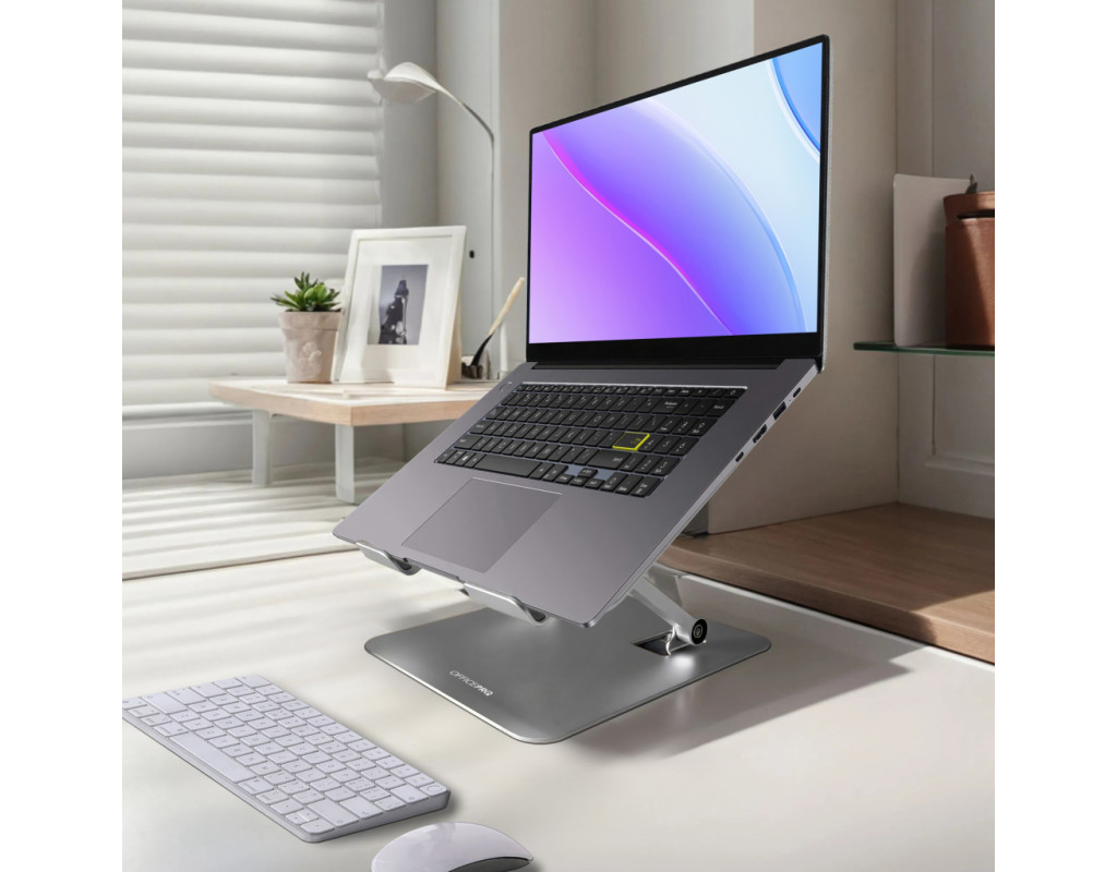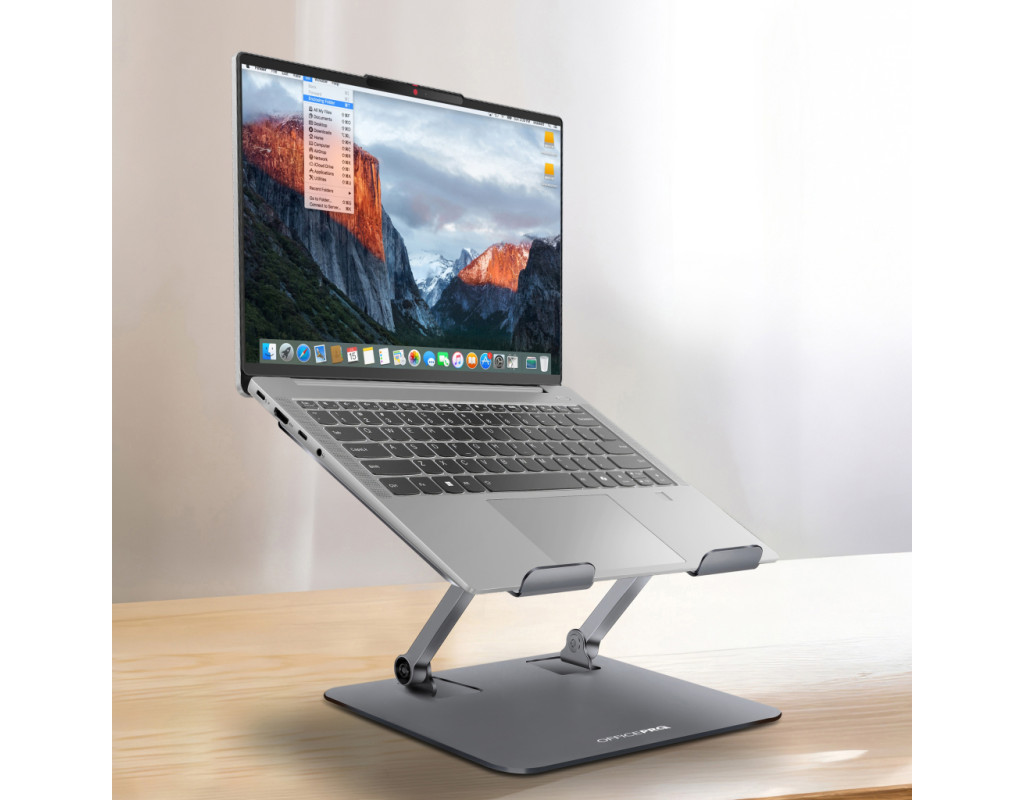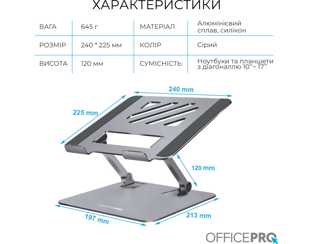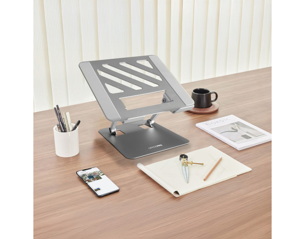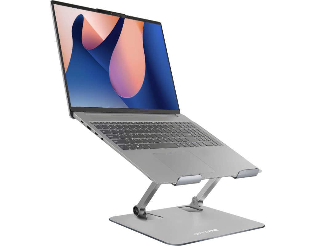 Оптимізуйте вашу робочу ефективність та комфорт з підставкою для ноутбука OfficePro LS797G, що поєднує мінімалістичний дизайн із зручністю використання. Завдяки регулюванню висоти та кута нахилу верхньої пластини, користувач може зручно налаштувати положення ноутбука для оптимального перегляду і комфортної роботи. Підставка виготовлена з надійного алюмінієвого сплаву, що забезпечує стійкість, легкість та довговічність використання, а також покращує теплообмін. Силіконові антиковзкі накладки на основі підставки та на опорній поверхні допомагають уникнути ковзання ноутбука та забезпечують його надійну фіксацію. Особливості: