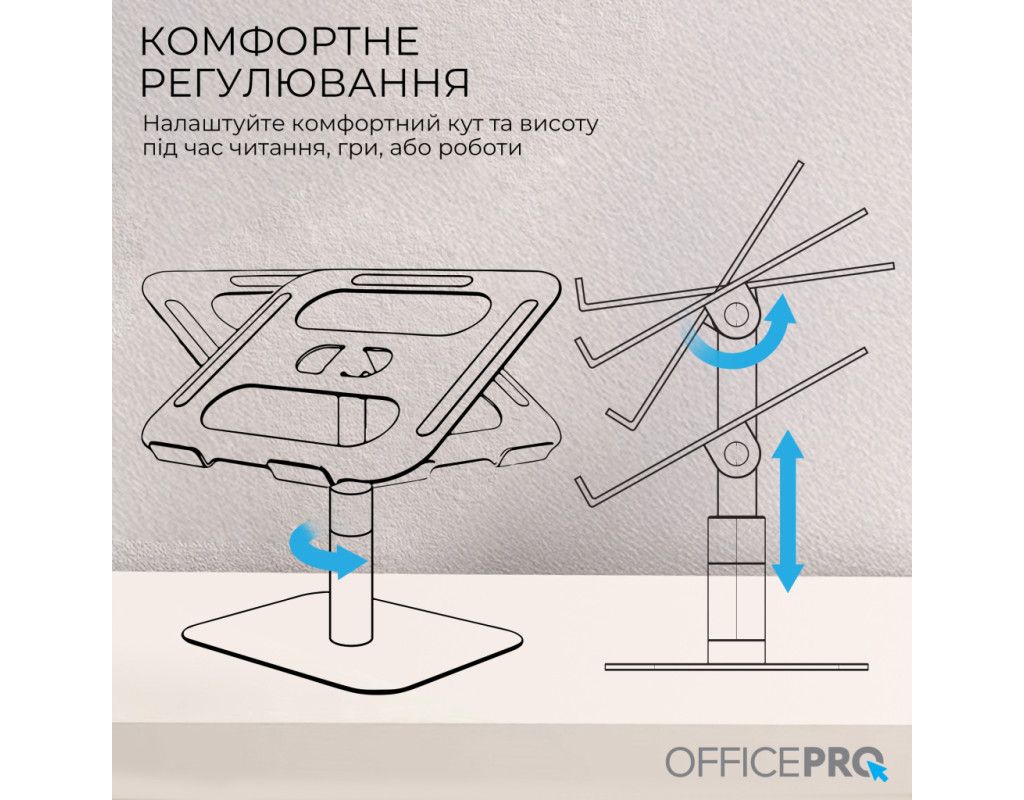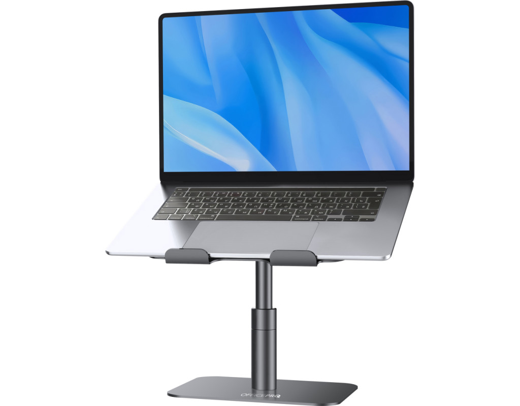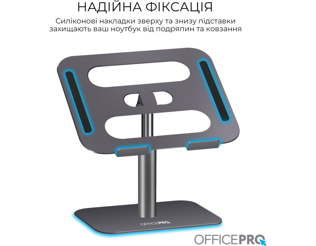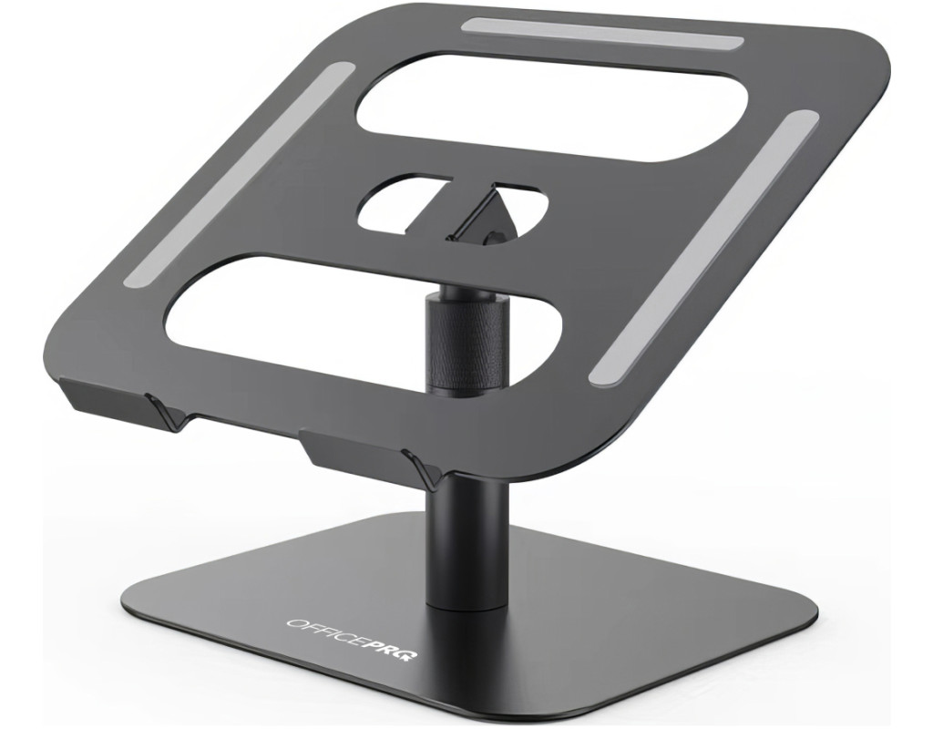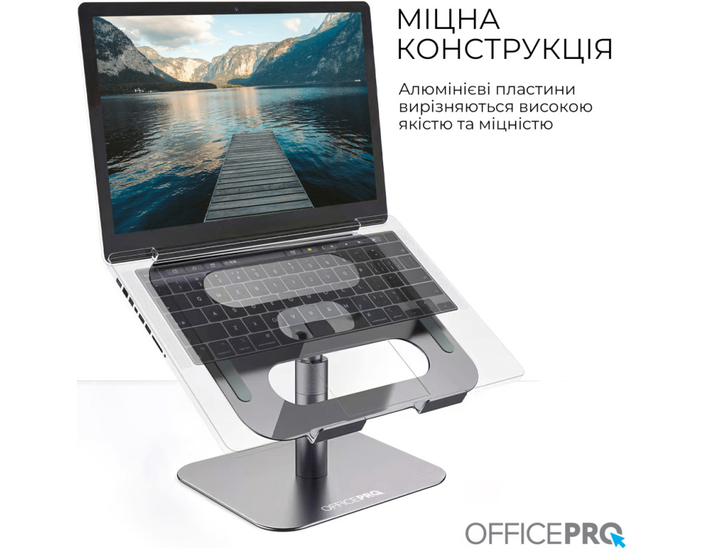 Оптимізуйте вашу робочу ефективність та комфорт з підставкою для ноутбука OfficePro LS956G, яка поєднує мінімалістичний дизайн із зручністю використання. Завдяки можливості регулювання висоти та кута нахилу верхньої пластини, користувач може легко налаштувати положення ноутбука для оптимального перегляду та комфортної роботи. Додатково, механізм обертання на 360° дозволяє швидко і легко змінювати орієнтацію пристрою, забезпечуючи повний доступ до всіх його портів та функцій. Це робить підставку ідеальним вибором для динамічної роботи та презентацій. Підставка виготовлена з надійного алюмінієвого сплаву, що забезпечує високу стійкість, легкість та довговічність використання. Крім того, конструкція сприяє ефективному теплообміну, що допомагає уникнути перегріву ноутбука під час тривалої роботи. Для додаткової безпеки передбачені силіконові антиковзкі накладки на основі підставки та на опорній поверхні. Вони допомагають уникнути ковзання ноутбука, забезпечуючи його надійну фіксацію та захист від подряпин. Особливості: