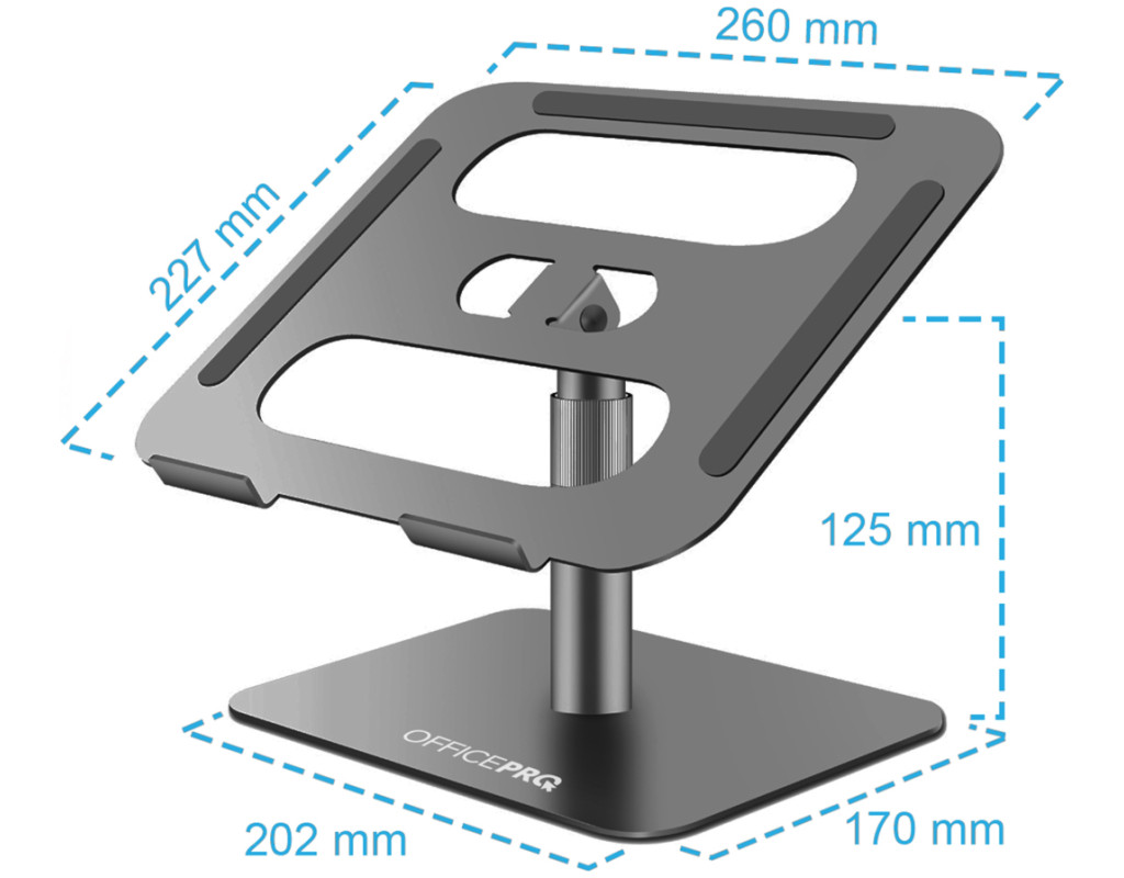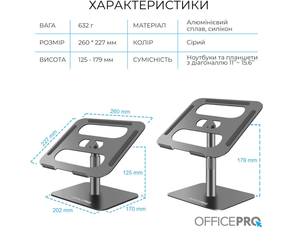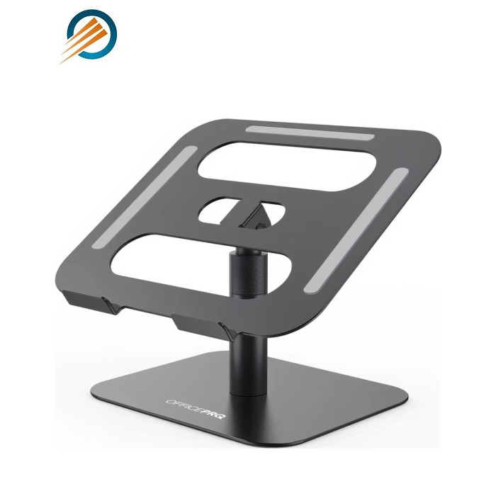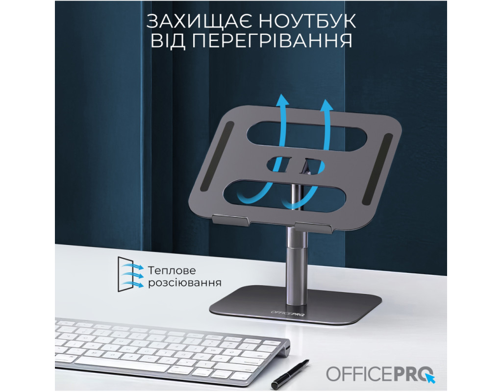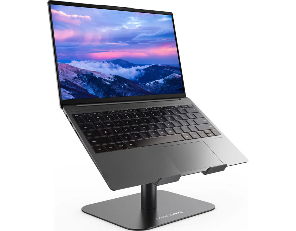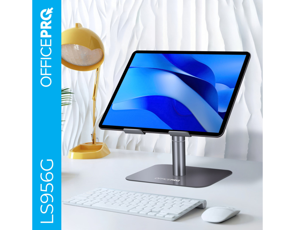 Оптимізуйте вашу робочу ефективність та комфорт з підставкою для ноутбука OfficePro LS956G, яка поєднує мінімалістичний дизайн із зручністю використання. Завдяки можливості регулювання висоти та кута нахилу верхньої пластини, користувач може легко налаштувати положення ноутбука для оптимального перегляду та комфортної роботи. Додатково, механізм обертання на 360° дозволяє швидко і легко змінювати орієнтацію пристрою, забезпечуючи повний доступ до всіх його портів та функцій. Це робить підставку ідеальним вибором для динамічної роботи та презентацій. Підставка виготовлена з надійного алюмінієвого сплаву, що забезпечує високу стійкість, легкість та довговічність використання. Крім того, конструкція сприяє ефективному теплообміну, що допомагає уникнути перегріву ноутбука під час тривалої роботи. Для додаткової безпеки передбачені силіконові антиковзкі накладки на основі підставки та на опорній поверхні. Вони допомагають уникнути ковзання ноутбука, забезпечуючи його надійну фіксацію та захист від подряпин. Особливості: