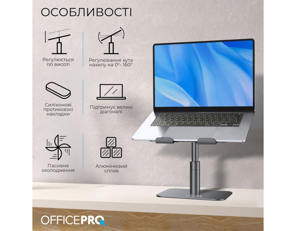 OfficePro LS956G – це стильне та функціональне рішення для комфортної роботи за ноутбуком, що забезпечує гнучкість, безпеку та оптимальні умови для продуктивності. |