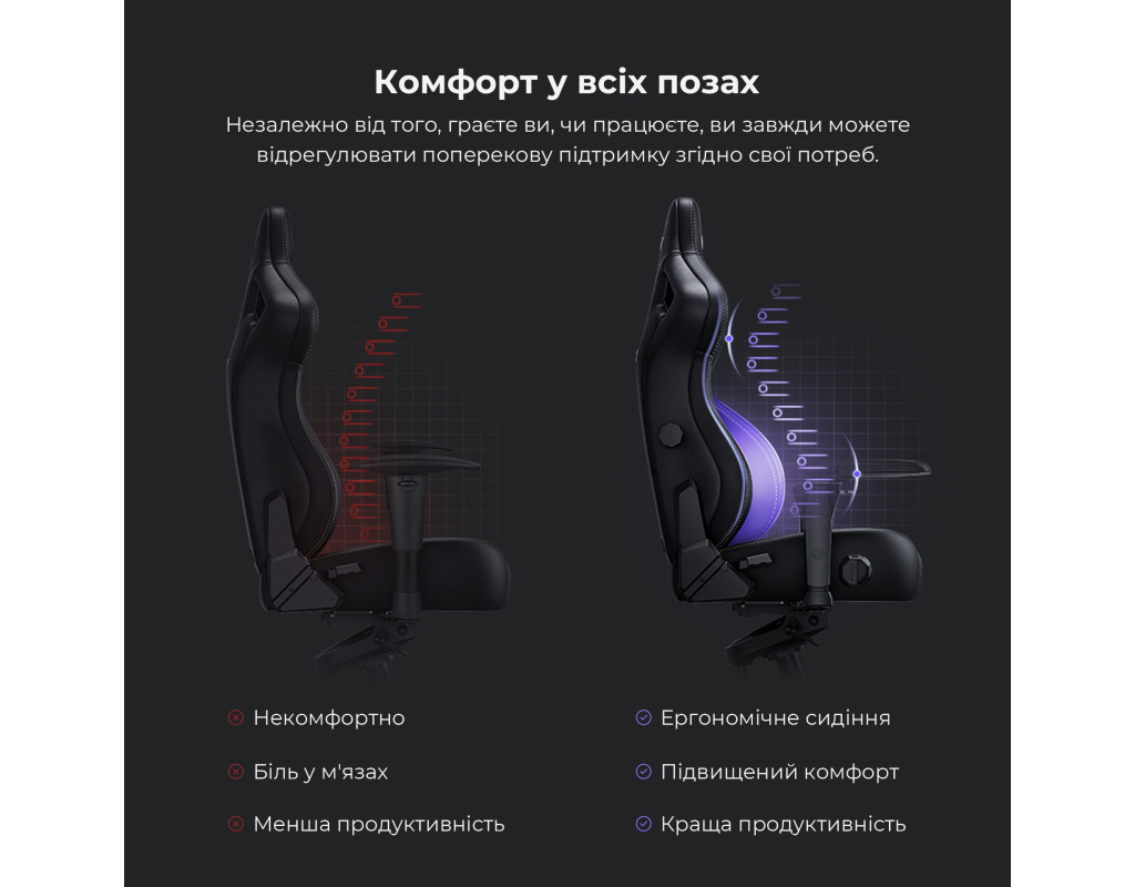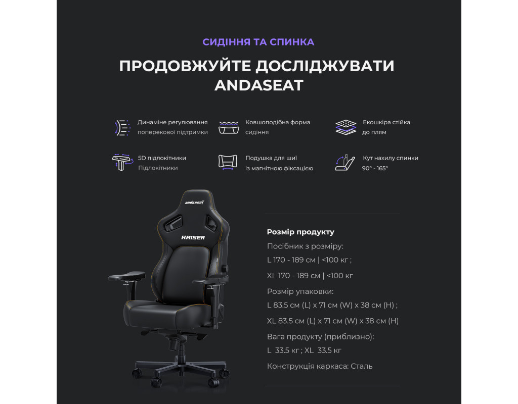 4-позиційне вбудоване регулювання. Нова вбудована система поперекової підтримки розроблена із простішою та гнучкішою можливістю регулювання. Вона забезпечує індивідуальну підтримку та комфорт поперекової частини спини, дозволяючи отримати природний і здоровий вигин хребта в кожній позі для сидіння. За допомогою швидкого натискання на важіль ви можете підібрати зручну позицію спинки крісла для максимальної підтримки. Спинка вільно реагує на ваші рухи, коли розблокована, і забезпечує міцну підтримку, коли вона у заблокованому положенні. Комфорт у всіх позах Незалежно від того, граєте ви, чи працюєте, ви завжди можете відрегулювати поперекову підтримку відповідно до свої потреб. Надійна стійкість до плям Покриття Kaiser 4 має надзвичайну властивість стійкості до плям. Завдяки захисному шару, його шкіра не дає плямам в’їдатися. Тож ви можете швидко очистити каву, крихти від закусок або відбитки домашніх улюбленців за допомогою вологої серветки. Для більш стійких плям підійде спиртовий спрей і серветка. Надзвичайна довговічність Завдяки перевіреній та схваленій стійкості до стирання, матеріал покриття розрахований на всі види використання. Вона створена для протистояння вицвітанню кольору під впливом ультрафіолету рівня 4 або вище, забезпечуючи гладку поверхню крісла, яка не зношується з кожним наступним використанням. 2000 Цикл випробування на стирання за Табером. 2000 Тест на стирання за Мартиндейлом Створено з турботою про планету та вас Шкіряний матеріал Kaiser 4 відповідає стандартам OEKO-TEX та RoHS. Забезпечує здорове сидіння. Магнітна подушка для шиї Прикріпіть подушку для шиї в будь-якому зручному для вас положенні за допомогою магнітної фіксації. Подушка містить пружну, еластичну піну з ефектом пам’яті , яка природним чином приймає форму голови та шиї. Крім того, завдяки охолоджувальному шару, вона зберігає вашу шию прохолодною навіть під час гарячих ігрових моментів 5D підлокітники Завдяки доданому режиму регулювання вгору, ви можете підняти комфорт рук і ліктів на абсолютно новий рівень за допомогою Kaiser 4, незалежно від того, чи граєте ви на ПК, чи на мобільних пристроях. Ергономічне сидіння з піною Memory foam Широке і глибоке сидіння підняте на 5° вгору, щоб сприяти більш прямому і здоровому положенню хребта. Піна високої щільності зменшує тиск на нижні кінцівки і зберігає форму навіть після багатьох років використання. Відкиньтеся на спинку сидіння і відпочивайте так, як вам подобається. Завдяки міцній конструкції та посиленій колісній базі, Kaiser 4 завжди прикриє вашу спину. 30° Режим гойдання Гойдайтеся з максимальним комфортом. Надміцний механізм нахилу забезпечує стабільне гойдання в будь-якій позі. 8 см Плавне налаштування висоти Завдяки газ-ліфту 4-го класу, сертифікованого SGS, можна без особливих зусиль отримати ідеальну висоту для ніг. |