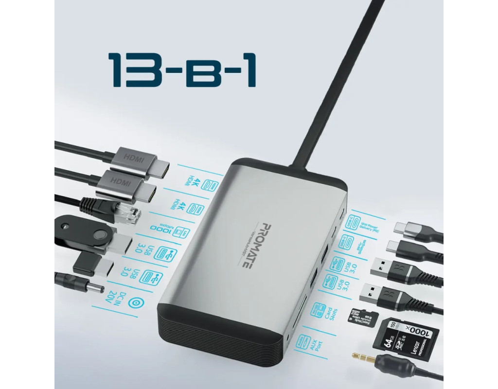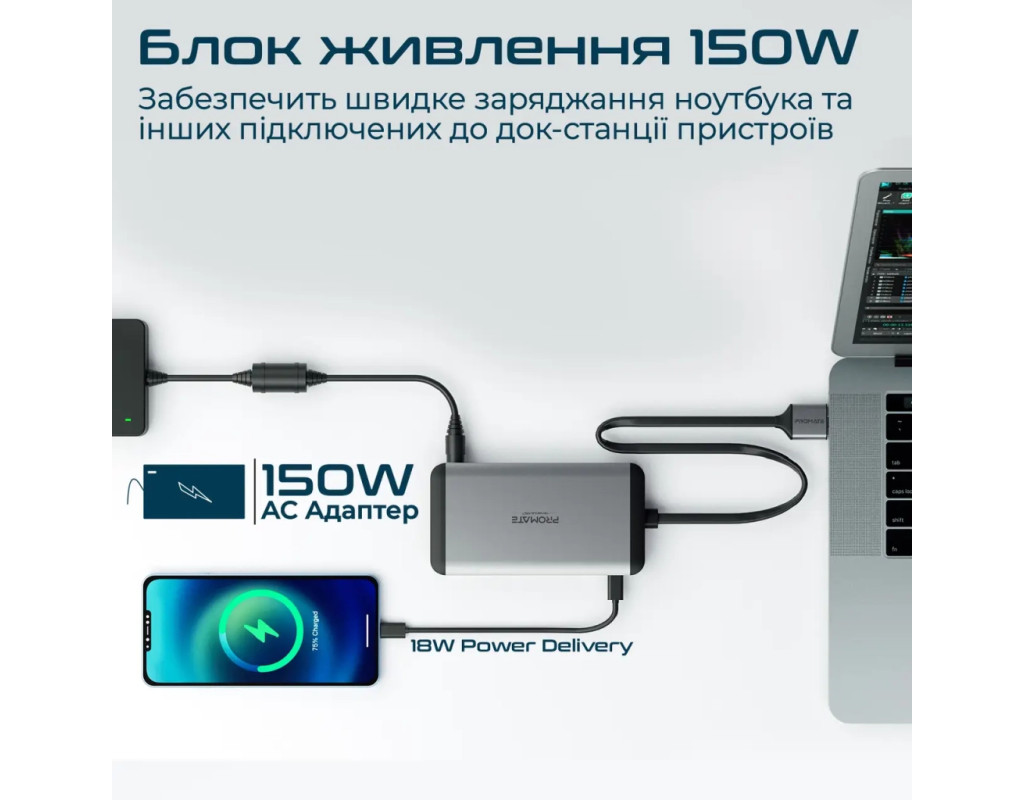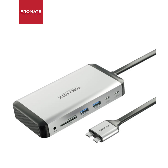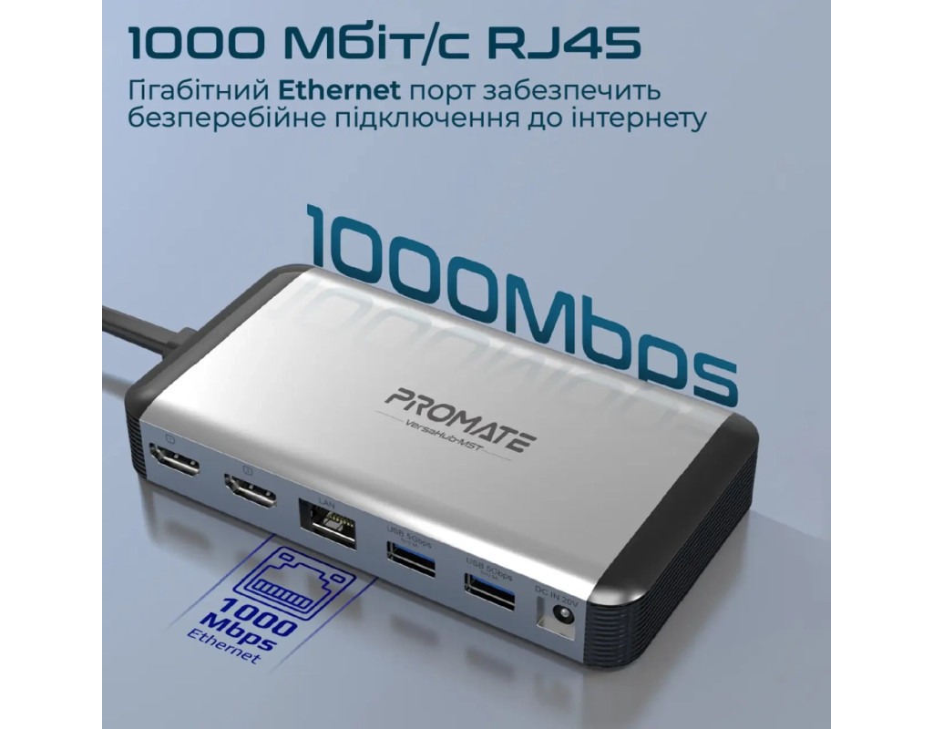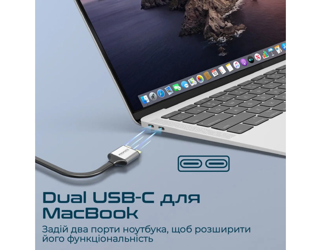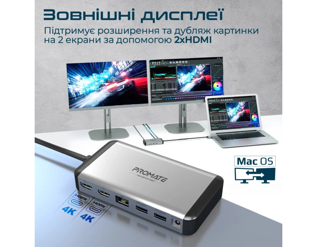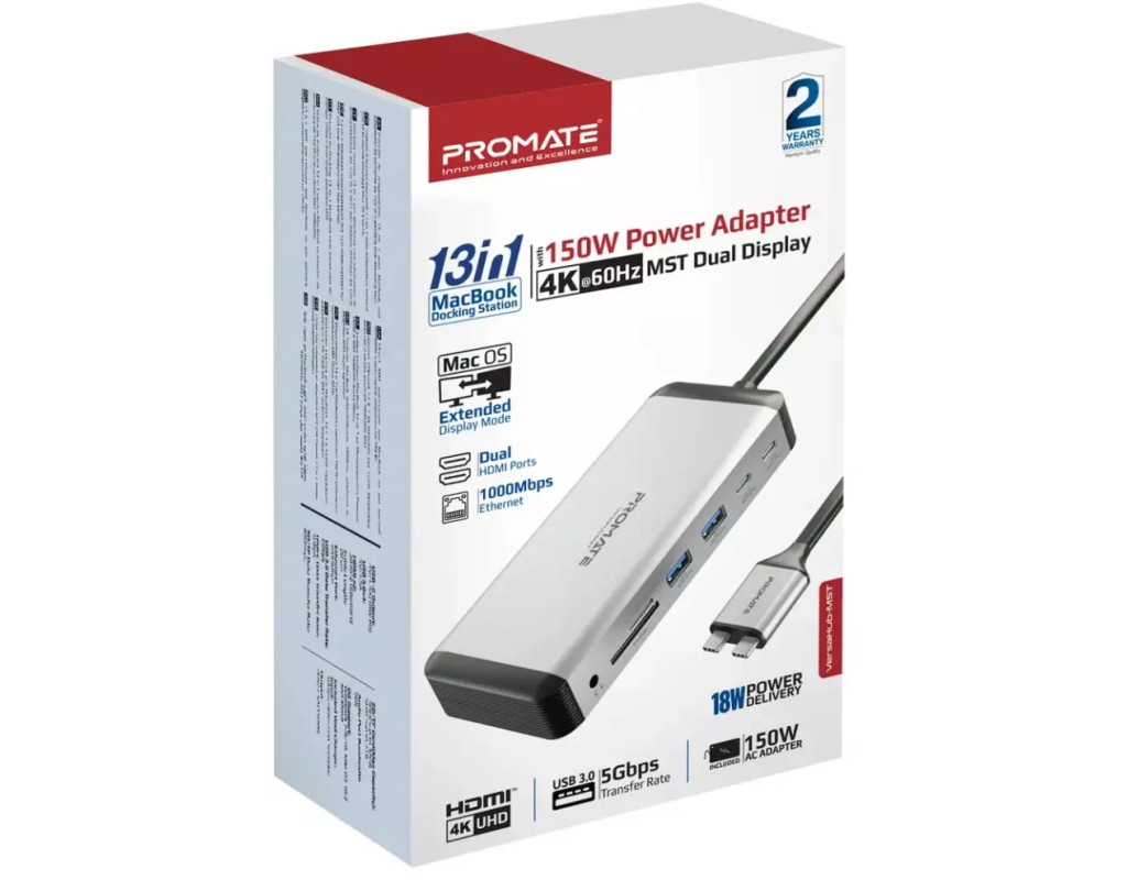 Promate VersaHub-MST - багатофункціональна док-станція для MacBook, яка перетворить 2 порти на 13. Підтримка 2-х зовнішніх моніторів за технологією MST, USB-C/USB-A порти для заряджання та синхронізації даних, високошвидкісний Ethernet роз'єм, кардрідер, 3.5 мм AUX порт і все це в корпусі з анодованого алюмінію. Особливості: • Dual USB-C для MacBook: Задій два порти ноутбука, щоб розширити його функціональність. • Зовнішні дисплеї: Виводь зображення з роздільною здатністю UltraHD 4K (3840x2160) 60 Гц через 2хHDMI. Підтримує режими дубляжу та розширення картинки одночасно на 2 екрани. • USB-C + 4xUSB-A 3.0: З пропускною здатністю 5 Гбіт/с гарантують стабільне з'єднання та швидку синхронізацію. • USB Type-C PD: Завдяки технології Power Delivery, хаб здатний приймати та передавати живлення від джерела на потужності до 18 Вт. • 1000 Мбіт/с RJ45: Гігабітний Ethernet порт забезпечить безперебійне підключення до інтернету. • Кардрідер: Підтримує microSD та SD карти. • AUX порт: Підключай навушники або акустичну систему з роз'ємом mini-jack 3.5 мм та насолоджуйся чистим звуком без шумів та перешкод. • Комплектний блок живлення 150 Вт: З запасом забезпечить швидке заряджання ноутбука та підключених до док-станції пристроїв. • Безпечний: VersaHub-MST оснащений чіпом Smart IC, який захищає підключені пристрої від перегріву, стрибків напруги, короткого замикання та надмірного заряджання. • Якісні матеріали: Легкий та надійний USB-хаб з анодованого алюмінію, не перегрівається і має великий запас міцності. • Plug & Play: macOS (10.2 і вище) та жодного додаткового ПЗ. Технічні характеристики: • Інтерфейс підключення: 2хUSB-C, 20V/5A (100W) • Вхідна напруга (від адаптера): 20V/7.5A (150W) • 2хHDMI порти: UltraHD 4K (3840x2160) 60 Hz • USB-C: 5 Гбіт/с, 5V/1.5A • USB-C PD: 12V/1.5A (18W) • 4xUSB 3.0 порти: 5 Гбіт/с, 5V/1.5A • Ethernet порт: 1000 Мбіт/с • Кардрідер: MicroSD (SDHC 32Гб), SD (SDXC 2Тб) до 480 Гбіт/с • AUX 3.5 мм порт • Пропускна здатність аудіопорту: 96K • Сумісність: macOS (10.2 та вище) • Матеріал: анодований алюміній, пластик • Розміри ШхВхГ: 75x25x143 мм • Довжина кабелю: 50 см • Вага: 267 г Комплектація: • Dual USB-C хаб • Адаптер живлення (150W) із мережевим кабелем • Інструкція з експлуатації |