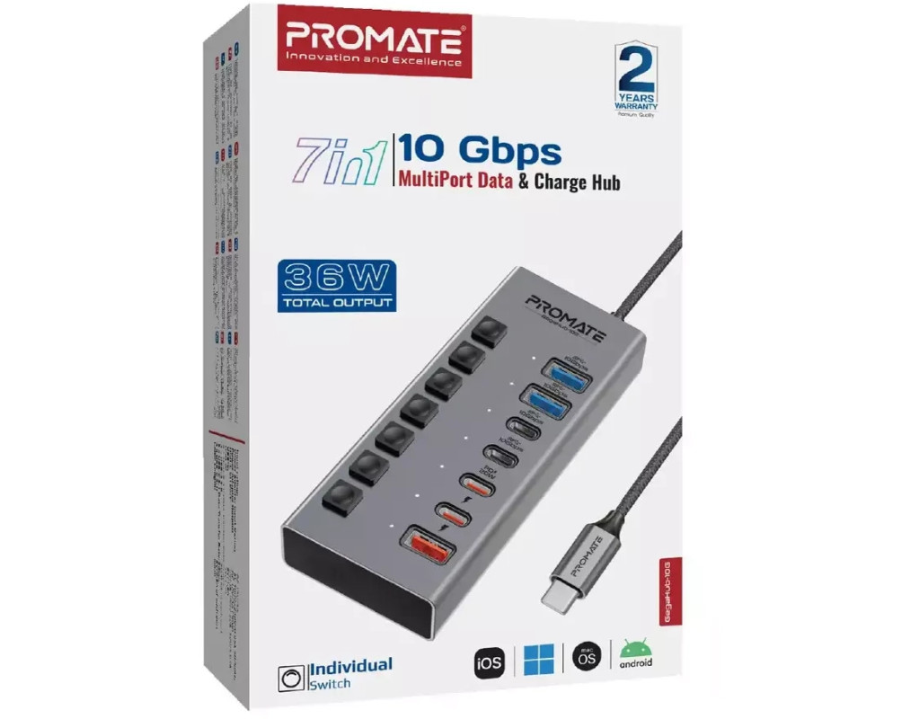 Promate Gegahub-10g- компактний та надійний USB-хаб. 7 портів, Power Delivery, 10 Гбіт/с, і все це в корпусі з анодованого алюмінію.