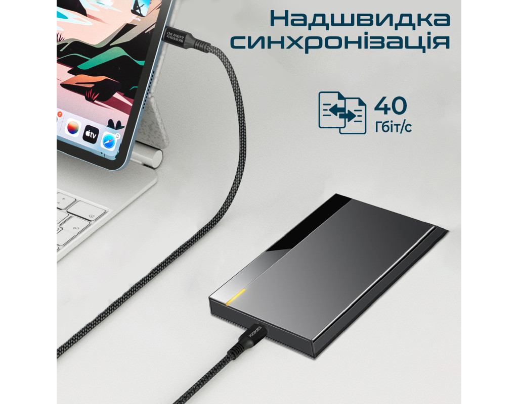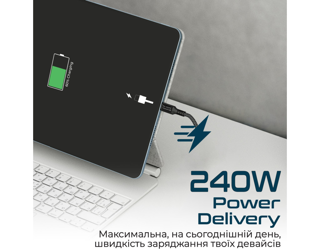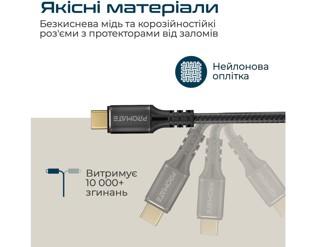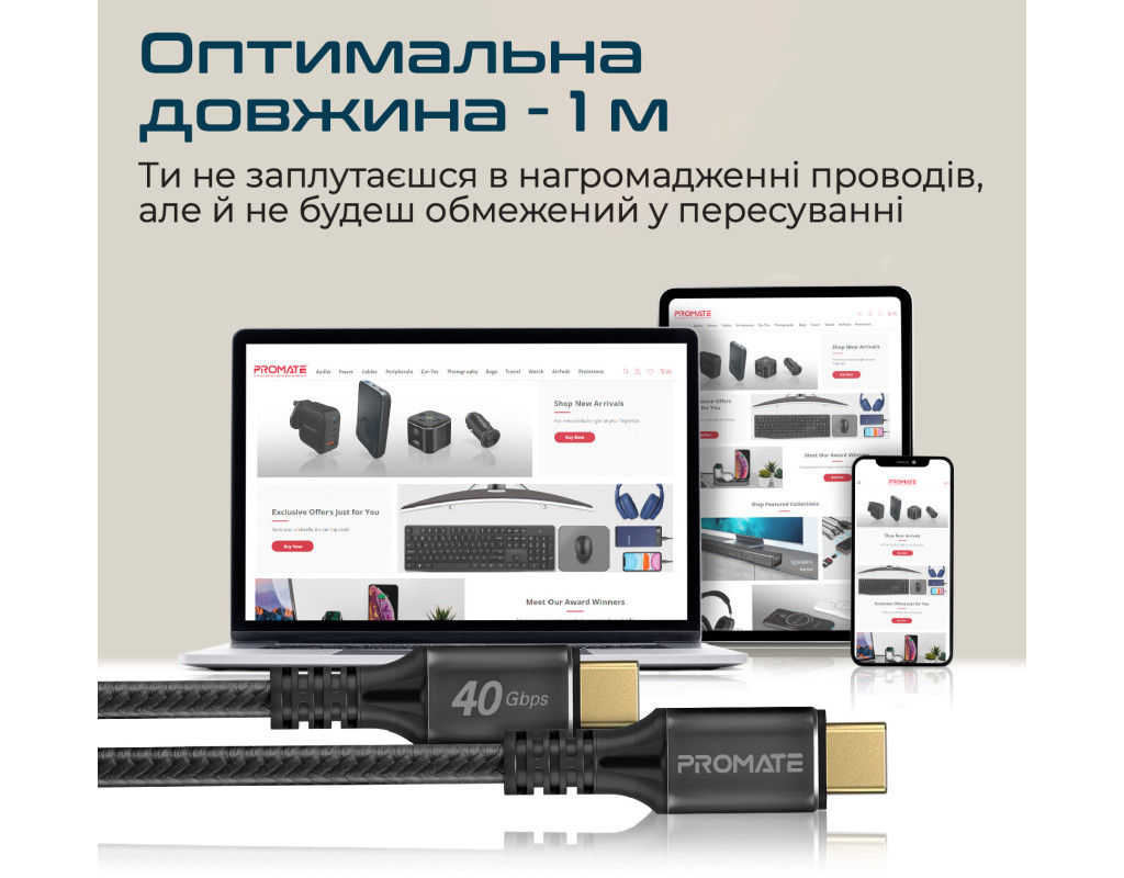 | Неймовірно швидке заряджання пристроїв на потужності 240W, передача інформації зі швидкістю 40 Гбіт/с, трансляція відео як 8К все це можливо з кабелем від Promate.