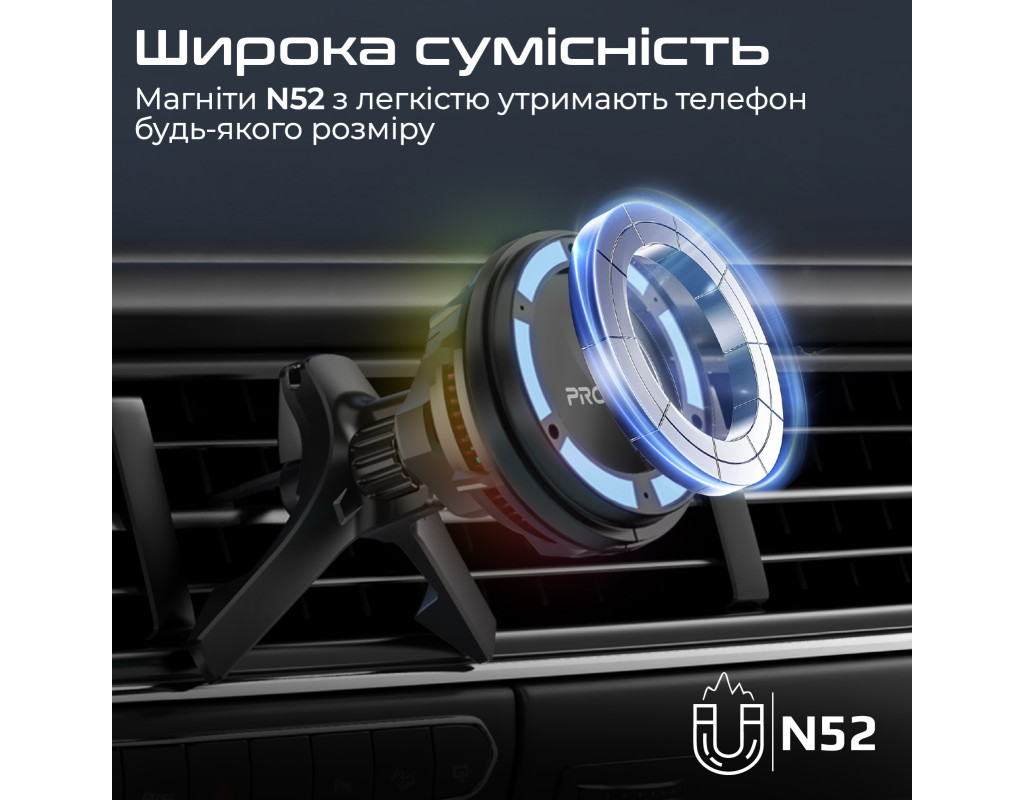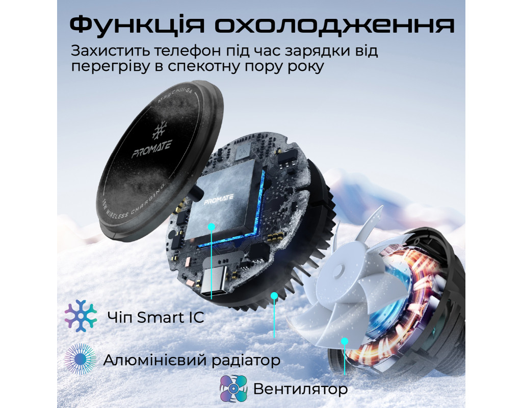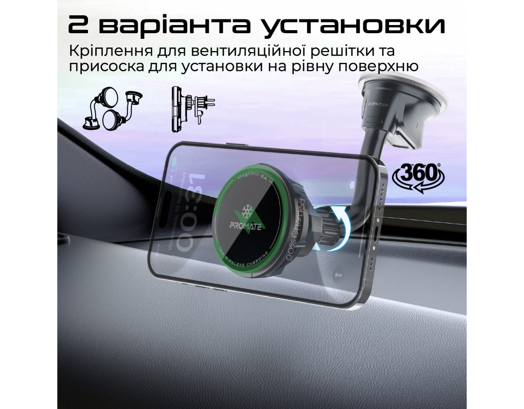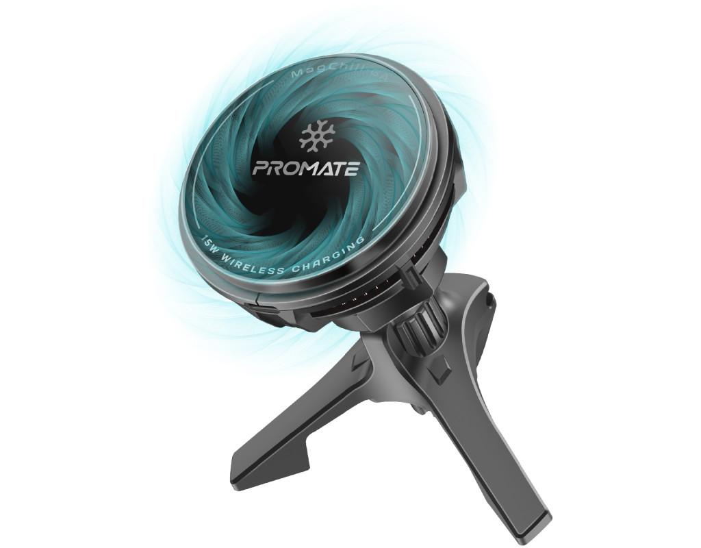 | MagChill-Ga – автомобільний тримач MagSafe від Promate з функцією охолодження пристрою під час заряджання. Кріплення на дефлектор з упорами забезпечує максимальну стійкість смартфона.