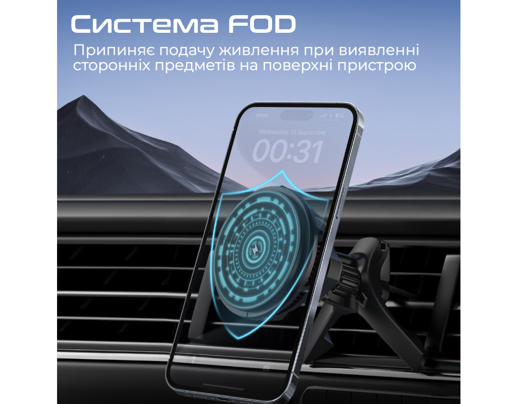 Особливості: - Магнітне кріплення MagSafe: Забезпечує ідеально точне співпадіння котушок на моделях iPhone 12 і вище, що гарантує зарядку з максимальним комфортом та ефективністю - Потужність 15W : Заряджайте телефон так само швидко, як і класичним способом - Функція охолодження: Забезпечить телефон під час заряджання від перегріву у спеку - 2 варіанти установки: Кріплення для вентиляційної решітки та вакуумна присоска для встановлення на торпедо або вітрове скло - Конструкція Anti-Shake: Забезпечує максимальну стійкість, мінімізуючи вібрації та рухи - Система FOD: Припиняє подачу живлення при виявленні сторонніх предметів на поверхні зарядного пристрою, унеможливлюючи перегрівання - Обертання на 360°: Регулювання положення тримача за допомогою 3D-шарніру - Безпека: Вбудований чіп Smart IC захистить твої пристрої від стрибків напруги, короткого замикання та надмірної зарядки - Першокласні матеріали: Корпус із високоякісного ABS пластику, забезпечує довговічність конструкції - Широка сумісність: Магніти N52 легко утримають телефон будь-якого розміру |