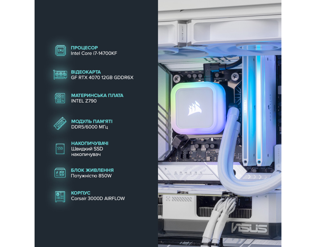 Персональний комп`ютер ASGARD (I147KF.32.S10.47.5267); Intel Core i7-14700KF (3.4 - 5.6 ГГц) / ОЗП 32 ГБ / SSD 1 ТБ / NVIDIA GeForce RTX 4070 12 ГБ / без ОД / LAN / Ubuntu / білий