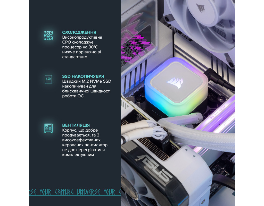 Геймер створює свій персоналізований, ігровий простір, де кожна деталь має особливе значення. Друк ваших улюблених героїв на корпусі, комплектуючі кращих виробників світу, безліч варіантів підсвітки - все це створить неймовірну атмосферу і ще більше занурить вас у світ гри.