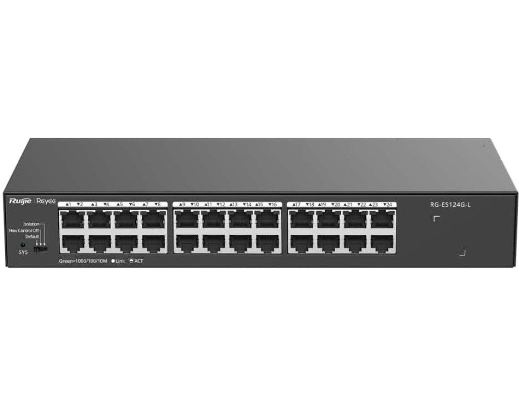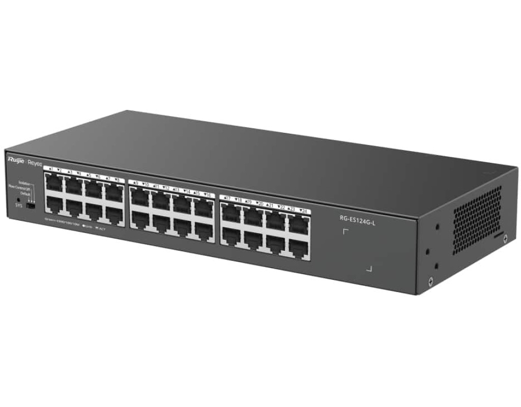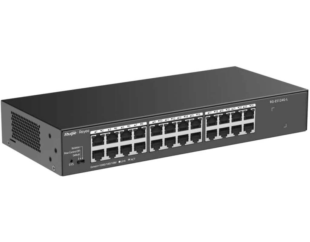 24-портовий 10/100/1000 Мбіт/с некерований не-PoE комутатор Некерований комутатор, який видно у Ruijie Cloud Безпечна та стабільна мережа відеоспостереження Високоякісний дизайн Застосовується до різних сценаріїв |