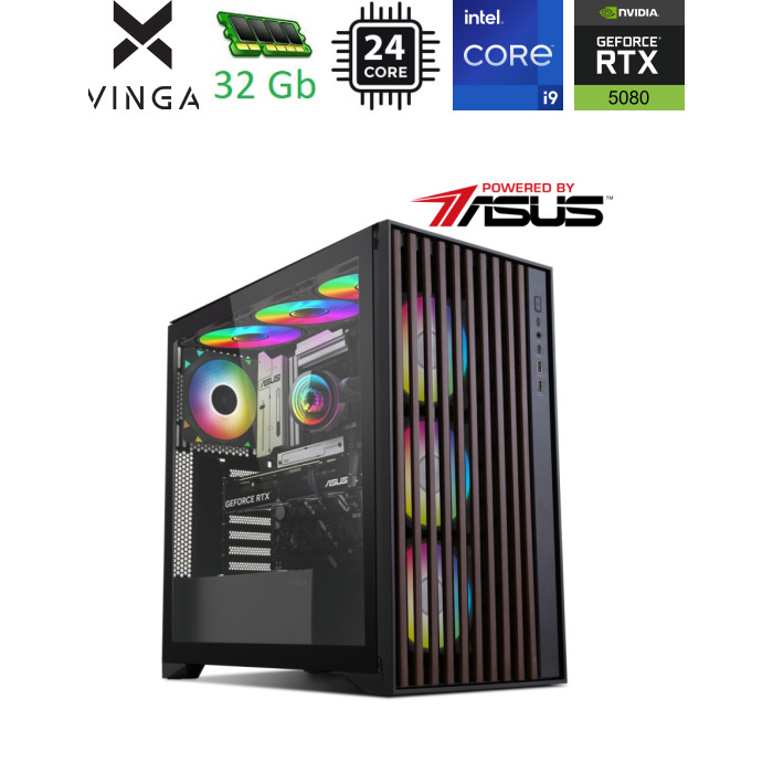 Потрібен комп'ютер, який забезпечить високу продуктивність в топових іграх і впорається з найбільш ресурсомісткими програмами? Знайомтеся — Vinga Odin D8560! Потужний процесор, ігрова відеокарта, продумана система охолодження — лише частина переваг моделі. Вона володіє достатньою обчислювальною потужністю для ігор класу ААА та комфортної роботи в професійних застосунках. Процесори Intel Core i9-14900KF Процесор Intel Core i9-14900KF – це потужний 24-ядерний процесор (16 ефективних та 8 продуктивних ядер), що використовується у збірці Vinga Odin D8560. Тактова частота в ефективному режимі становить 2.4 ГГц та 3.2 ГГц для продуктивного ядра, а для вирішення динамічних навантажень вона піднімається до 4.4 та 6.0 ГГц. Це можливе завдяки технології Turbo Boost. Але таке зростання продуктивності призводить до великого тепловиділення – 253 Вт. Щоб процесор не давав збоїв високих температур, використовується хороше охолодження. До переваг Intel Core i9-14900KF належить 36 МБ кешу, підтримка 32 потоків, можливість використання швидкої оперативної пам'яті DDR5. Процесор дозволяє встановити ОЗУ DDR4 3200 МГц або DDR5 5600 МГц об'ємом до 192 ГБ. Ігрова відеокарта GeForce RTX 5080 Vinga Odin D8560 гарантує гарне зображення як в іграх, так і при перегляді відео. Це заслуга відеокарти GeForce RTX 5080, яка вийшла у 2025 році. RTX 5080 — це передовий графічний прискорювач, створений на базі архітектури NVIDIA Blackwell. Інноваційні RT-ядра четвертого покоління та потужні тензорні ядра п’ятого покоління забезпечують проривні можливості нейронного рендерингу та максимальну продуктивність у найвибагливіших завданнях. У відеокарті GeForce RTX 5080 завдяки новій мікроархітектурі впроваджено елементи машинного навчання. Зокрема, технологія NVIDIA DLSS 4 забезпечує виняткову якість згладжування та покращує продуктивність. У результаті ви зможете насолоджуватися відтворенням відео у форматі 4K з частотою оновлення до 480 Гц або 8K з частотою 165 Гц завдяки підтримці DSC (Display Stream Compression). Основні характеристики дискретної картки GeForce RTX 5080:
