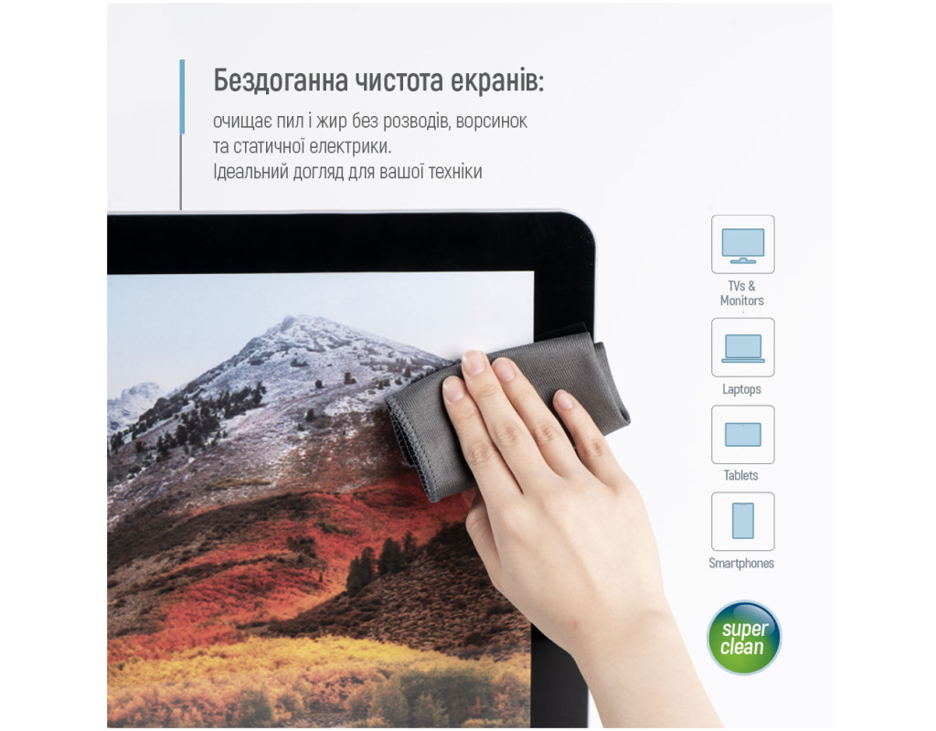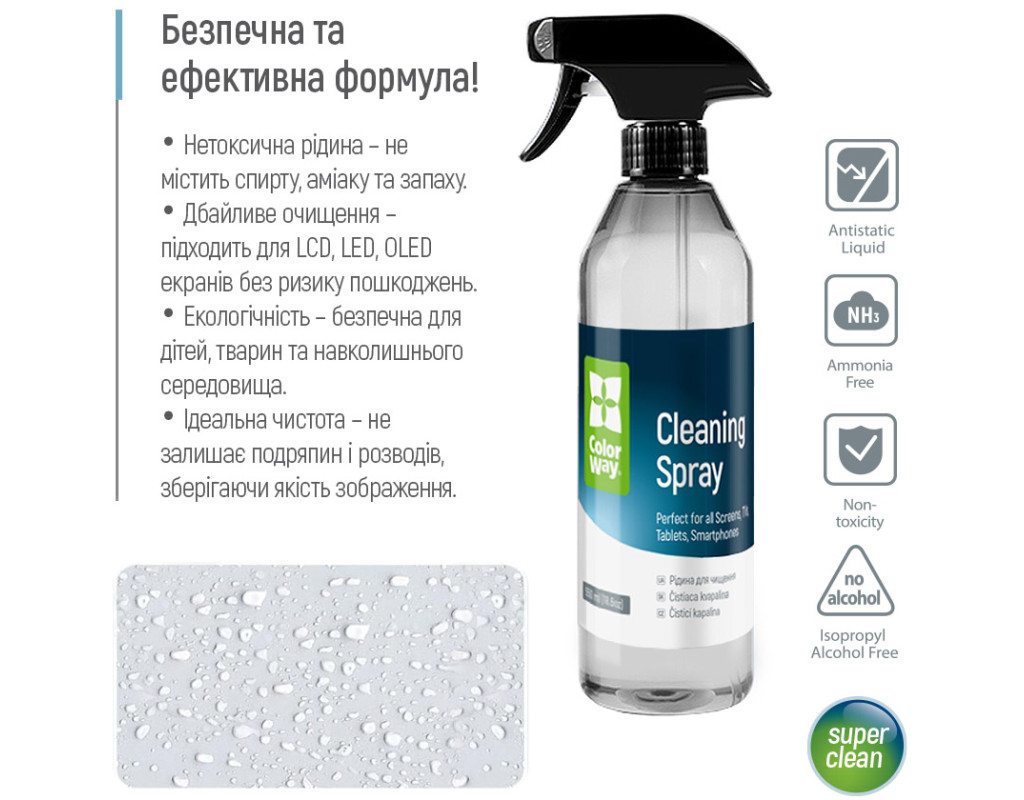Чистячий набір ColorWay для делікатного очищення всіх типів екранів: TВ, моніторів, планшетів, ноутбуків та смартфонів. Очищає пил і жир на різних електронних пристроях, не залишаючи розводів, залишків, ворсинок і статичної електрики. Нетоксичний та безпечний рідина - не містить спирту, аміаку та запаху, що робить її абсолютно безпечною для екранів різного типу, зокрема LCD, LED і OLED дисплеїв, та безпечна для дітей, домашніх тварин та не шкодить навколишньому середовищу. Цей засіб ефективно очищує, не залишаючи подряпин чи розводів, що дозволяє досягти ідеальної якості зображення без пошкодження поверхонь. У комплекті також є дві мікрофіброві серветки, які делікатно очищають екрани та полірують їх до блиску. Конструкція розпилювача ефективно запобігає протіканню, запобігає випадковому розбризкуванню. Дві різні серветки для більш ретельного очищення.
