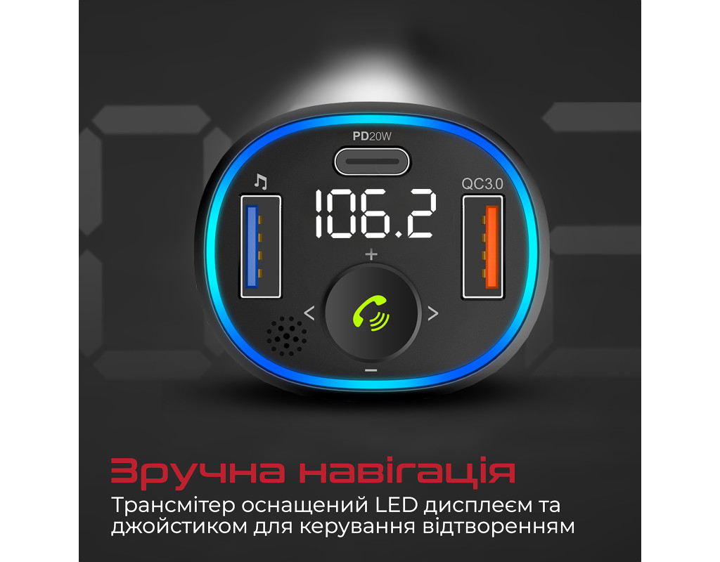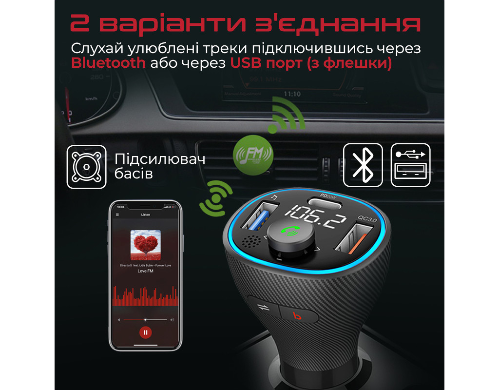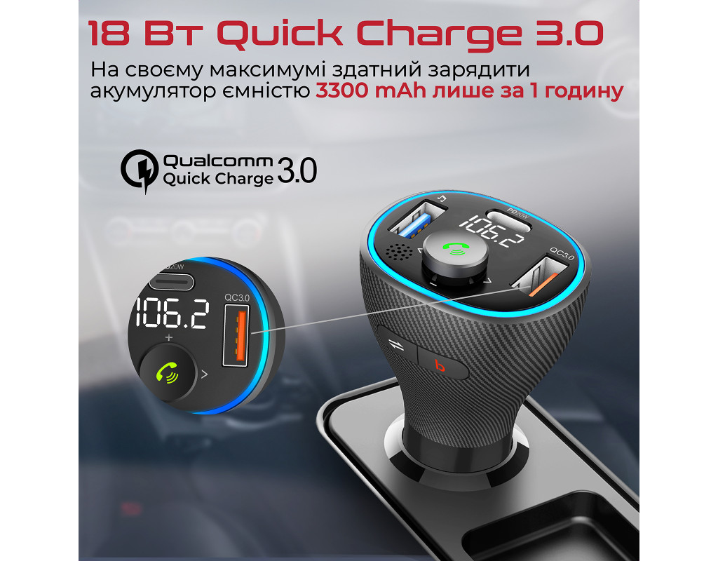 2 варіанти з’єднання: Слухай улюблені треки підключившись через Bluetooth або через USB порт (з флешки). Bluetooth 5.1: Завжди стабільний і якісний сигнал без переривання та відставання аудіодоріжки від потокового відео. Вбудований мікрофон: Відповідай на дзвінки одним натисканням кнопки, звук виводиться на динаміки автомобіля. Підсилювач басів: Прокачай свою аудіосистему та насолоджуйся насиченим звуком. Проста навігація: Трансмітер оснащений LED дисплеєм та зручним джойстиком для керування відтворенням. 2 через 1: Заряджай 2 пристрої одночасно на сумарній потужності до 38 Вт. USB-C 20 Вт Power Delivery: Забезпечить максимальну, на сьогоднішній день, швидкість заряджання iPhone (50% за 30 хвилин). 18 Вт USB-A Quick Charge 3.0: На своєму максимумі здатний зарядити акумулятор ємністю 3300 mAh лише за 1 годину. Працює у трьох режимах: 5В/3А, 9В/2А, 12В/1.5А. Безпека: Вбудований чіп Smart IC захистить PowerTune-38W та підключені до нього пристрої від перегріву, стрибків напруги, короткого замикання та надмірного заряджання. |
