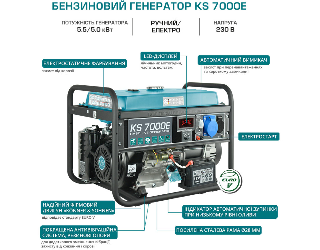 ІНДИВІДУАЛЬНІ СЕРІЙНІ НОМЕРИ НА ДВИГУНАХ Двигуни відповідають усім світовим та європейським стандартам якості, економічності, екологічності (зокрема рівень шкідливих викидів та рівень шуму). Кожний двигун та кожний генератор мають свої індивідуальні серійні номери, що дозволяє нам контролювати якість виробництва та сервісного обслуговування. Двигуни Konner & Sohnen вирізняються легким стартом та пониженою вібрацією. Лінійка бензинових генераторів KS 7000 оснащена надійним 1-циліндровим двигуном потужністю 13 к.с. ЛЕГКА ТА ЗРУЧНА СИСТЕМА СТАРТУ Система полегшеного старту дозволяє швидко завести двигун, не докладаючи значних зусиль. Більш потужні моделі додатково обладнані системою електричного старту для зручності викоричтання. АЛЬТЕРНАТОР З 100% МІДНОЮ ОБМОТКОЮ В генераторах TM «Konner & Sohnen» встановлений високоякісний альтернатор синхронного типу з 100% мідною обмоткою. Тільки мідна обмотка може витримувати максимальні навантаження без будь-яких ушкоджень, що гарантує довготривалу надійну роботу генераторної установки. ЗРУЧНА ЕРГОНОМІЧНА ПАНЕЛЬ КЕРУВАННЯ Ергономічна панель керування генератора дозволяє з легкістю керувати його роботою завдяки зручному розташуванню усіх функцій: сучасного LED-дисплею (лічильник мотогодин, частота, вольтаж), електрозапуску (опціонально), автоматичного вимикача при перенавантаженнях, датчику низького рівня оливи, розеток, роз’єму заземлення, клем та інше. СТАЛЕВИЙ БАК Генератори «Konner & Sohnen» оснащені сталевим паливним баком збільшеного розміру, що подовжує час роботи генератора без дозаправки. На баці розміщений індикатор рівня палива для зручності використання. ПОДВІЙНА АНТИВІБРАЦІЙНА СИСТЕМА Всі моделі генераторів ТМ «Konner & Sohnen» оснащені подвійною антивібраційною системою, що забезпечує зниження шуму та подовжує роботу генератора. Двигуни закріплені на високоякісних каучукових подушках. Посилена сталева рама має гумові опори для додаткового зниження вібрації, від ковзання та корозії. |