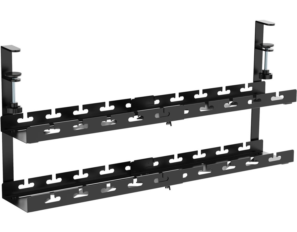 Дві полиці забезпечують більше місця для зберігання. А конструкція із регулюванням ширини підходить для різних розмірів столів і потреб у зберіганні. Легко встановлюється за допомогою міцних затискачів та може вміщати кабелі, хаби, подовжувачі і адаптери живлення. Ремінці для кріплення кабелів, що входять у комплект, легко впорядковують і закріплюють кабелі, не створюючи безлад на робочому місці. |