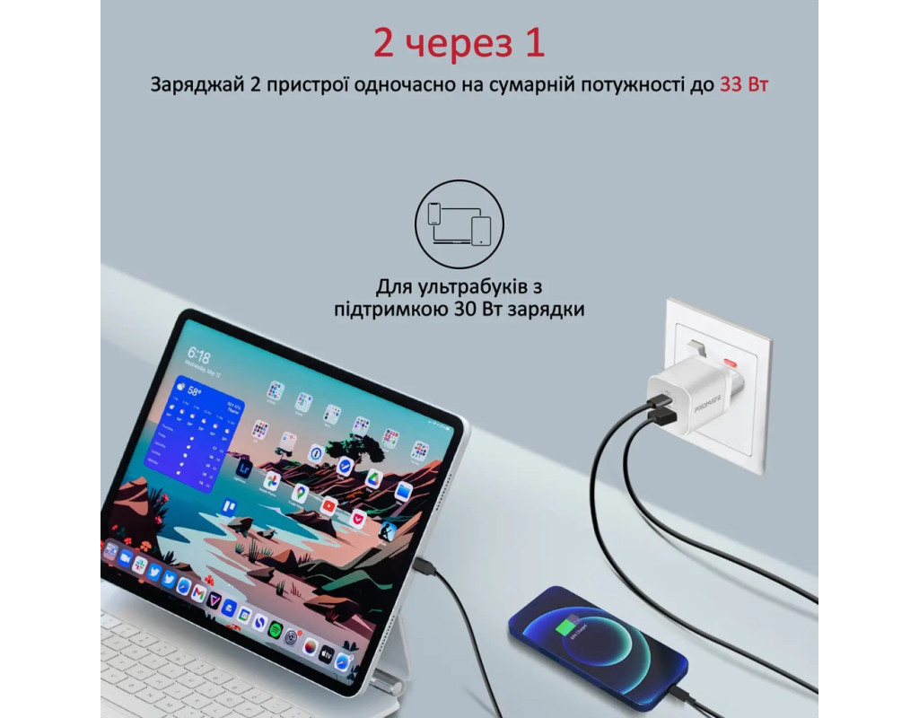 | Зарядний пристрій Promate 33W USB-C + USB-A (powerport-33.white) — це втілення інновацій у світі мобільної електроніки. Завдяки використанню прогресивної технології GaNFast, цей адаптер ефективно перетворює енергію, підвищуючи її ефективність на 40%. Компактний дизайн, який на 50% зменшений завдяки нітриду галію, робить його ідеальним вибором для подорожей і щоденного використання. Висока якість складання та матеріали преміум-класу гарантують довгий термін служби вашого пристрою. Підтримка технологій Power Delivery та Quick Charge 3.0 забезпечує надшвидке заряджання різних гаджетів: смартфонів, планшетів, TWS навушників, фітнес-браслетів, геймпадів і навіть сучасних ультрабуків. Завдяки подвійним портам USB Type-C і USB-A, ви з легкістю можете заряджати одразу два пристрої, мінімізуючи час очікування. Максимальна вихідна потужність в 33 Вт і максимальний струм 4.5 А дозволяють заряджати пристрої максимально швидко. З технологією USB-C 33 Вт Power Delivery 3.0 ви отримуєте шість режимів заряджання, що автоматично налаштовуються під конкретні характеристики гаджета. USB-A Quick Charge 3.0 – це можливість зарядити акумулятор на 3400 мА·год менше ніж за годину. Безпека ваших пристроїв гарантована інтегрованим чіпом Smart IC, який захищає від небажаних стрибків напруги, перегрівання та коротких замикань. Це означає, що ви завжди можете покластися на Promate PowerPort-33, насолоджуючись зручною, швидкою та безпечною зарядкою у будь-який момент. Оберіть якість та інновацію з Promate! |