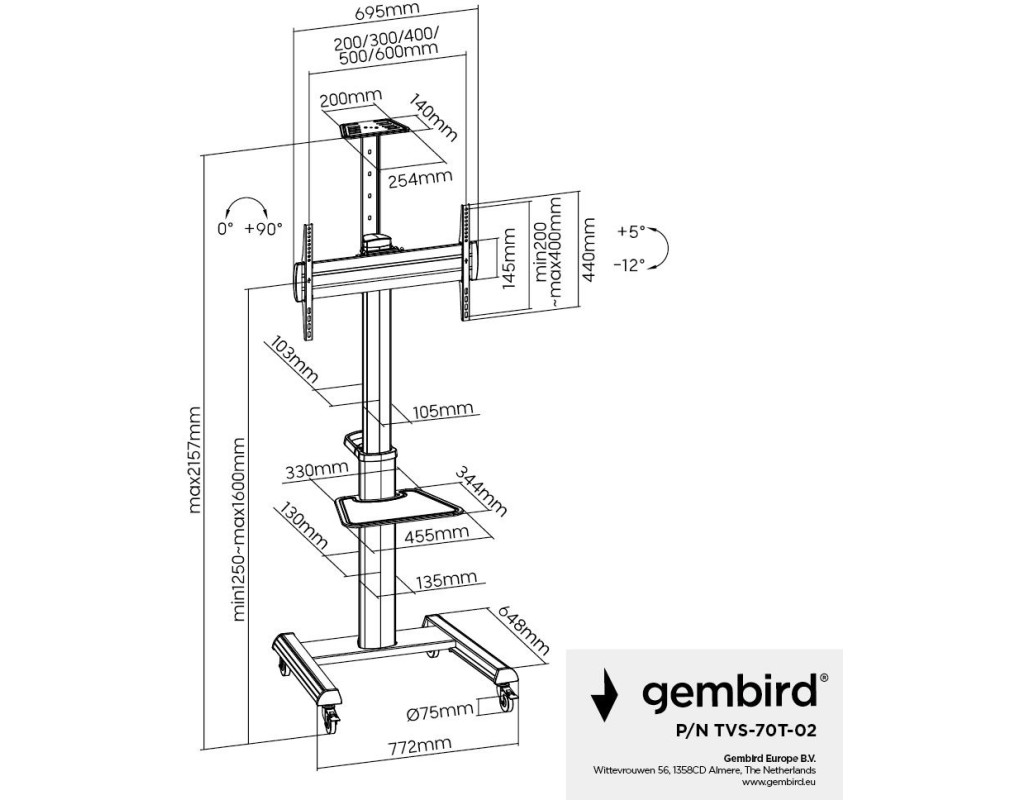 | Gembird TVS-70T-02 - підлогова підставка для телевізора з регулюванням висоти з коліщатками, 37"-70" (до 70 кг)