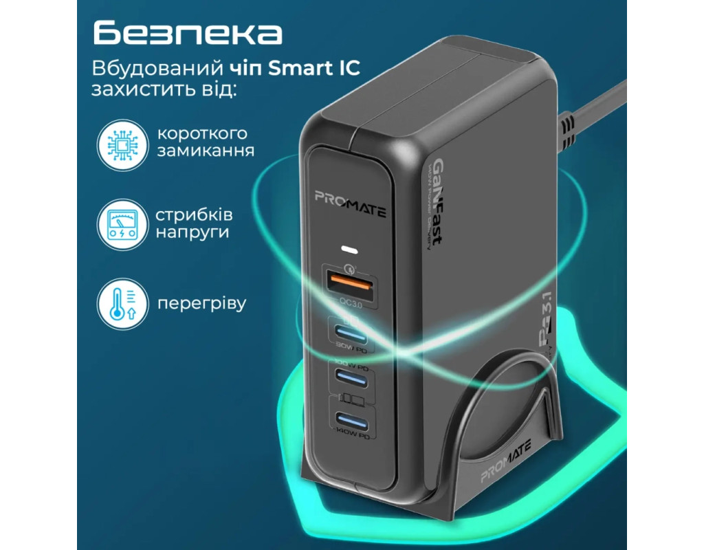 - Безпека: Вбудований чіп Smart IC захистить GaNPort-140W та підключені до нього пристрої від стрибків напруги, перегріву, короткого замикання та надмірної зарядки.