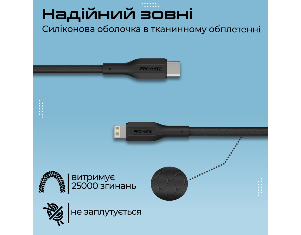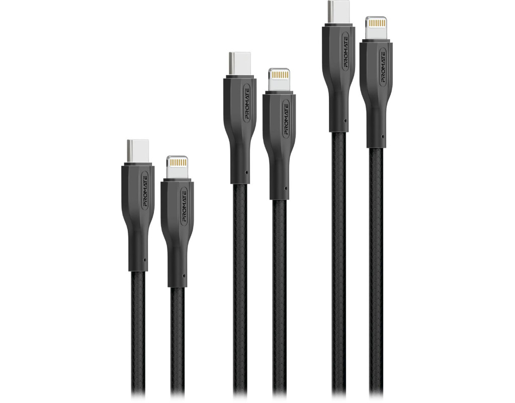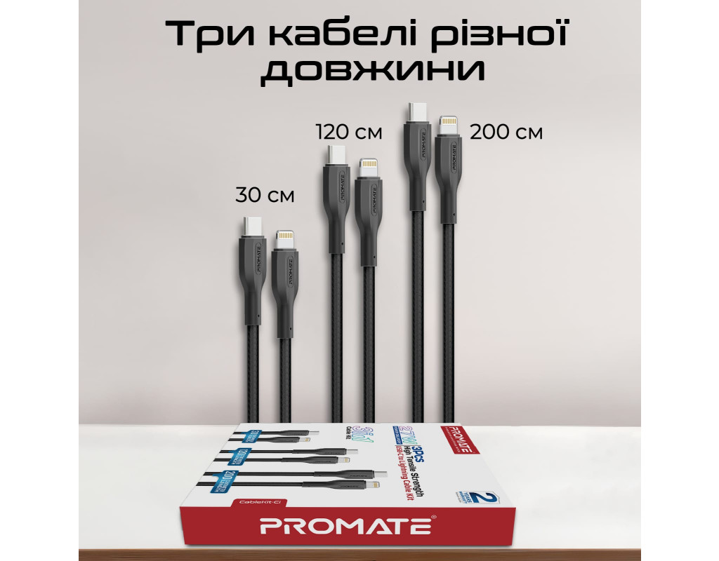 | Promate CableKit-Ci- комплект із 3-х USB-C to Lightning кабелів різної довжини з підтримкою 27 Вт Power Delivery. Забезпечують максимальну зручність у будь-яких ситуаціях.