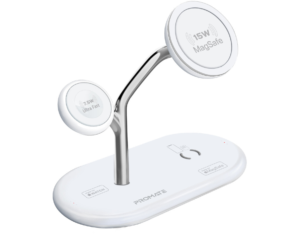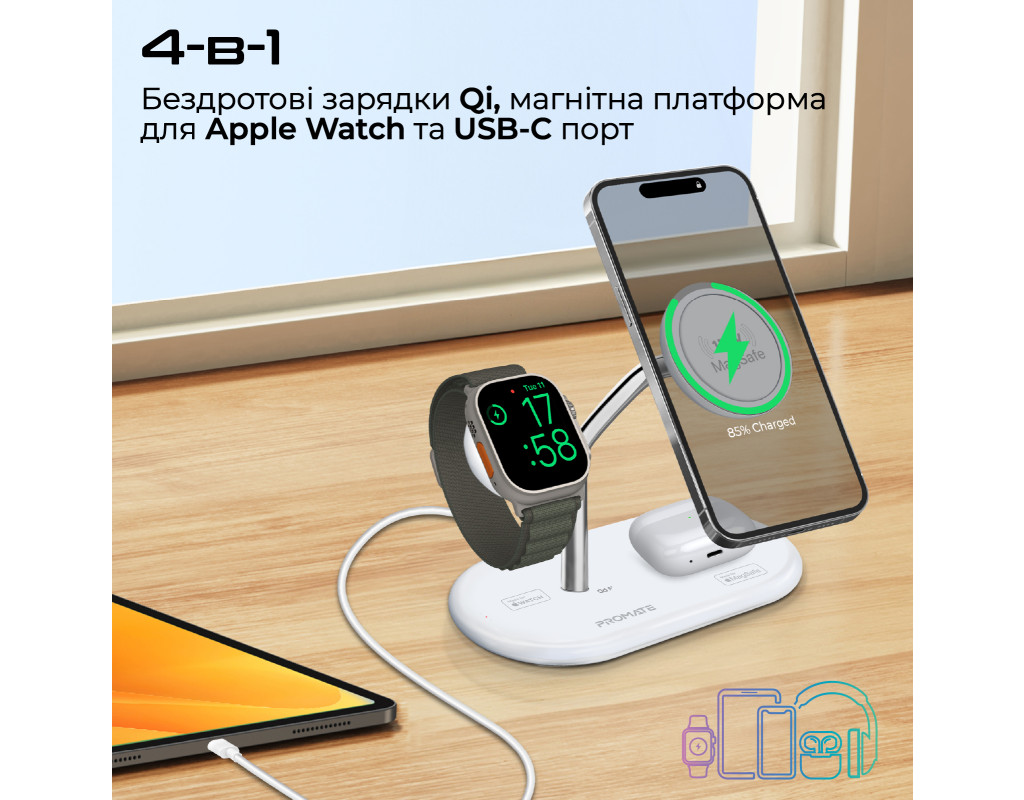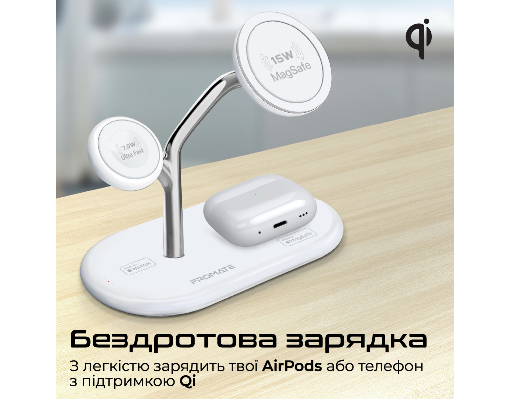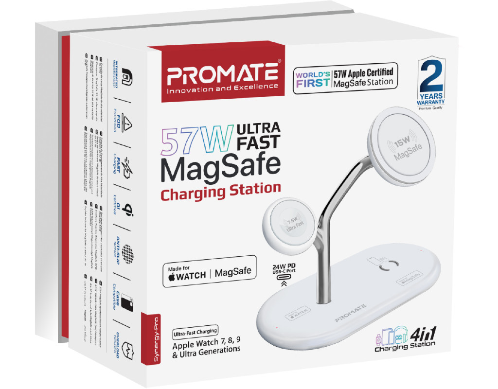 | Promate Synergy-Pro - покращена версія топової зарядної станції Synergy з MFi сертифікацією. Швидка зарядка для Аpple Watch та всієї твоєї техніки Apple в одному гаджеті.
