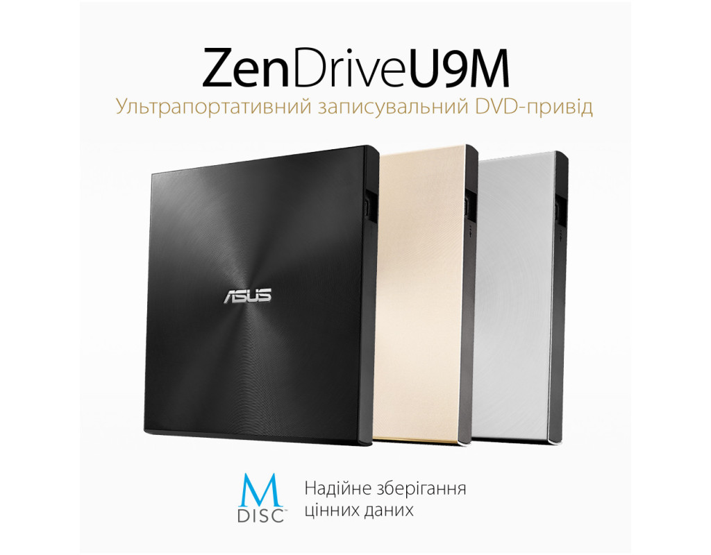 | Оптичний привод у стилі ультрабуків ASUS ZenDrive U9M — це зовнішній записувальний DVD-привод, виготовлений у тонкому корпусі з відмітним дизайном у стилі Zen. Завдяки підтримці інтерфейсів USB Type-A і Type-C, його можна легко під'єднати до будь-якого сучасного комп'ютера. Стильний корпус з оригінальним дизайном у стилі ZenПривод ASUS ZenDrive U9M має корпус завтовшки всього 13 мм, що робить його ідеальним аксесуаром для тонких і легких ноутбуків. Його прикрашає оздоблення, подібне до концентричних кіл, типове для пристроїв ASUS, виготовлених у стилі Zen. Два інтерфейсиЗа допомогою включених до комплекту поставки кабелів цей привод можна під'єднати до портів USB, виготовлених і як традиційний роз'єм Type-A, і як оборотний роз'єм Type -C. ЗахистНа відміну від багатьох інших оптичних приводів, ASUS ZenDrive U9M є сумісним із носіями формату M-Disc, які можуть зберігати записану на них інформацію понад тисячу років, у той час як традиційні жорсткі диски і «флешки» гарантовано слугуватимуть не більше ніж десятиліття. Технологія M-Disc — ідеальний засіб архівного зберігання особливо цінних даних. Функціональне програмне забезпеченняДо комплекту програмного забезпечення, що постачається з ASUS ZenDrive U9M, входить Nero BackItUp — зручний засіб створення резервних копій даних, призначений для Android-смартфонів і планшетів, CyberLink Power2Go 8 — інструмент для записування оптичних дисків із функцією шифрування конфіденційних файлів, а також PowerBackup — автоматизована система резервного копіювання для комп'ютерів. |