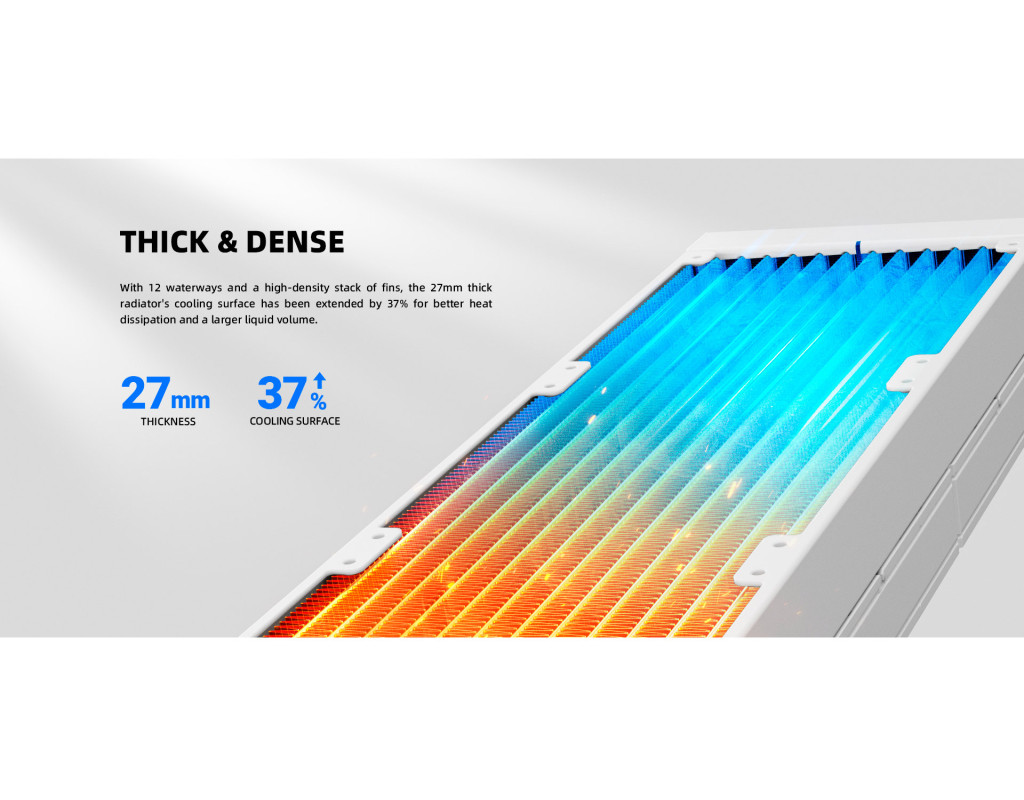 ID-Cooling FX240 INF — система водяного охолодження процесора, оснащена підсвіткою вентиляторів ARGB, яка подарує системі яскравий та неповторний вигляд. Виріб оснащений алюмінієвим радіатором, який допомагає швидше охолодити процесор. Вентилятор має широкі лопаті, які здатні захопити велику кількість повітря. За одну хвилину виріб виконує 300~2000 обертів. Підключається пристрій за допомогою конекторів 4Pin ШІМ + 5V 3Pin ARGB. Завдяки міцній нейлоновій структурі, довговічність трубки підвищується, мінімізуючи ризик згинання, розриву та витоку рідини. Дизайн виробу вирізняється яскравою підсвіткою, яка ідеально доповнить ігровий ПК із прозорою боковою панеллю. |