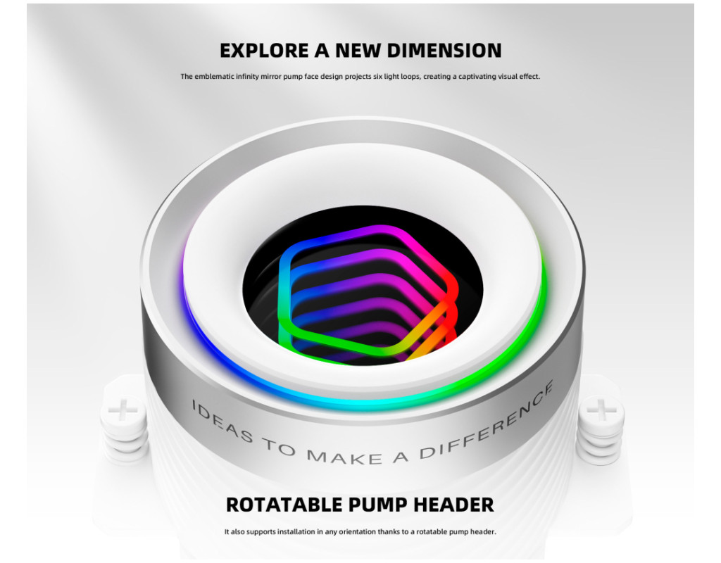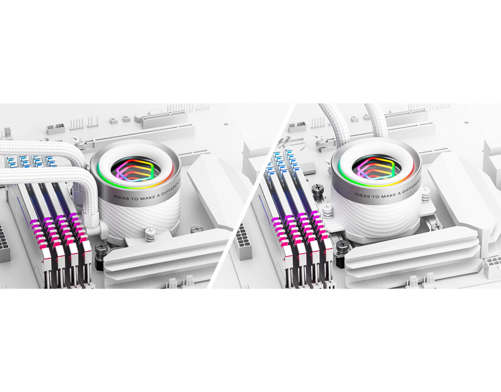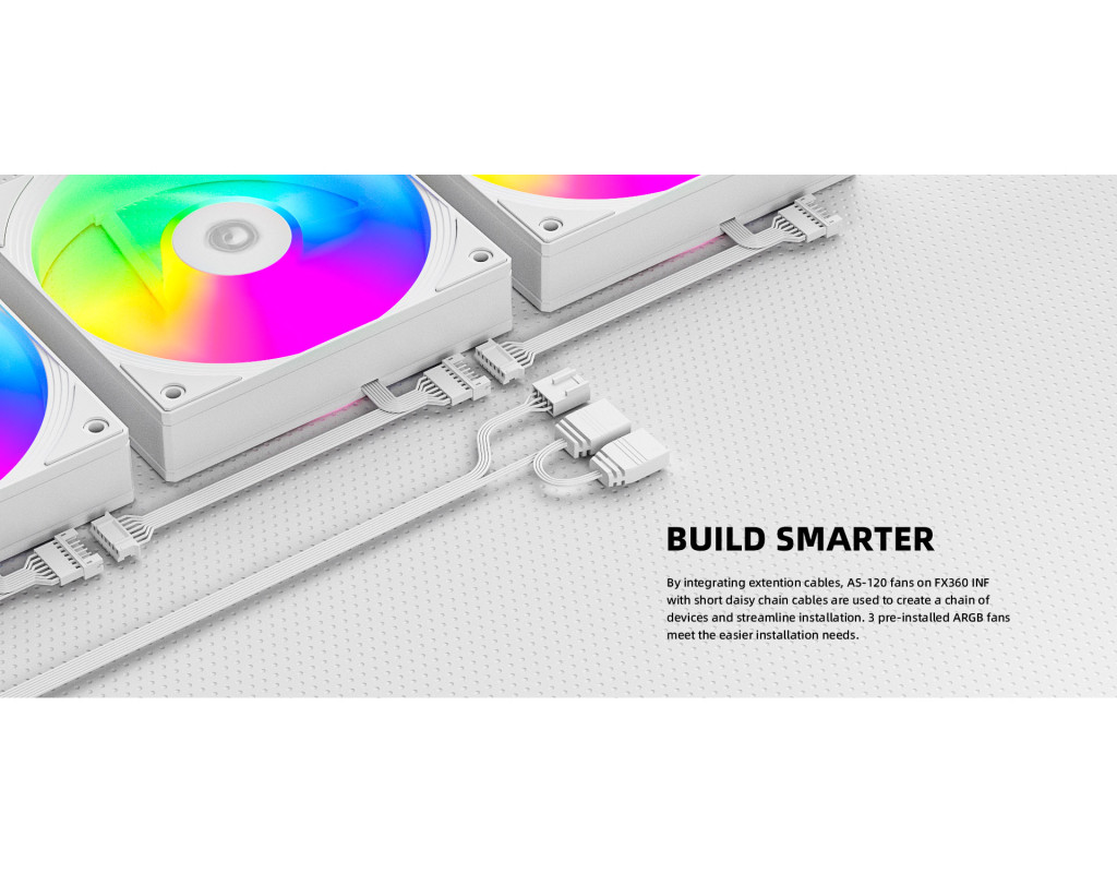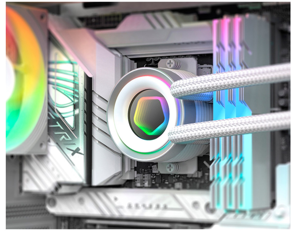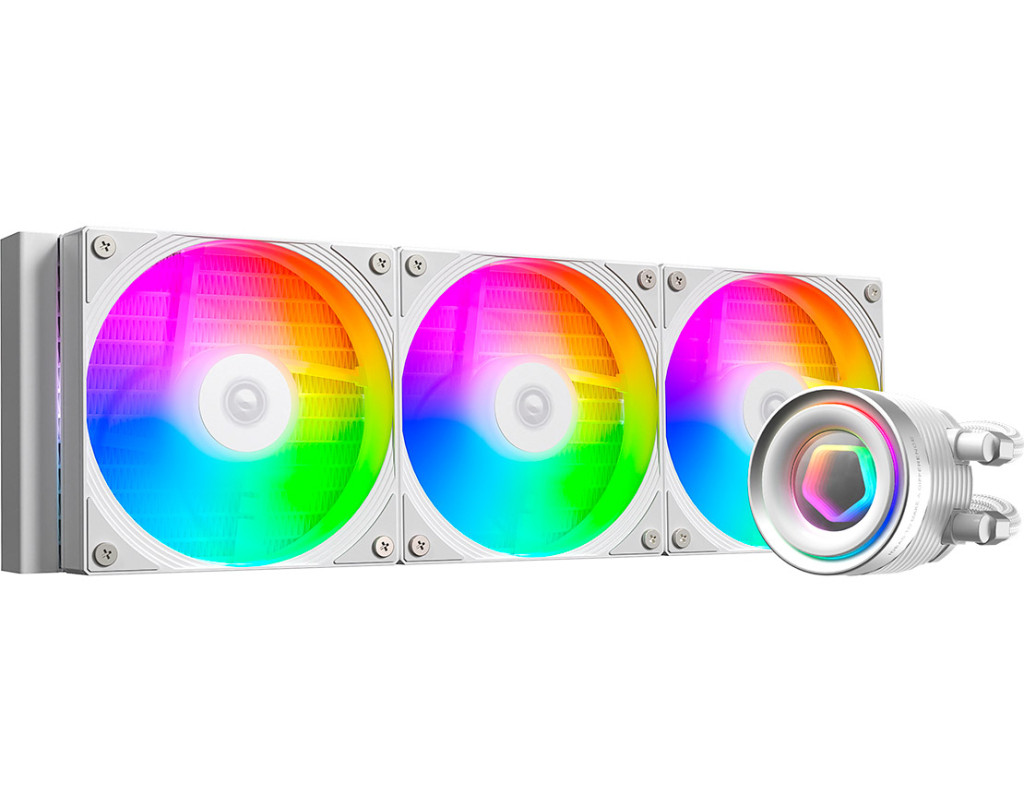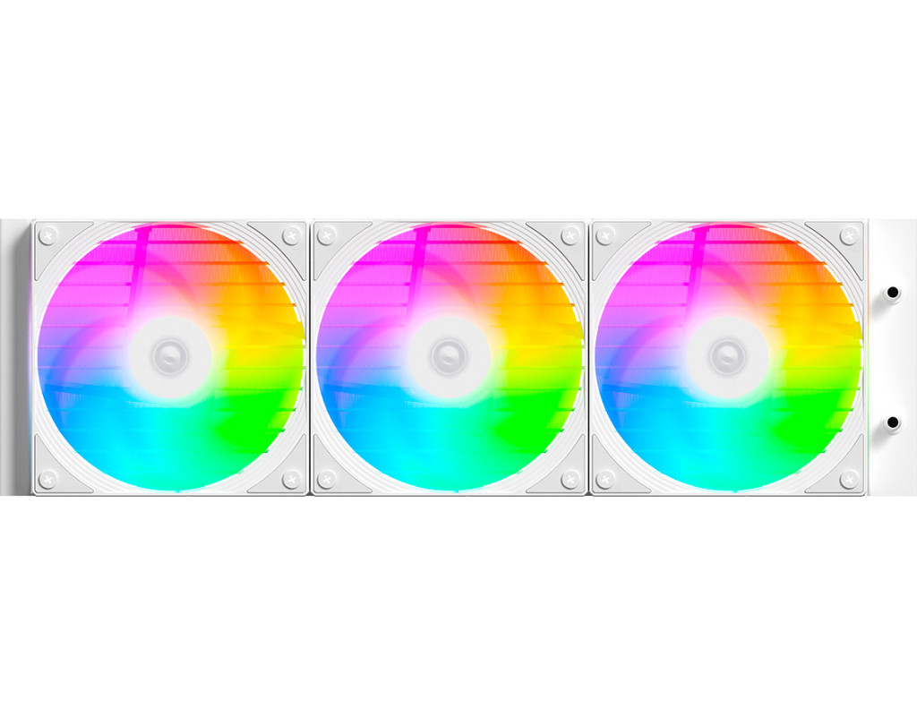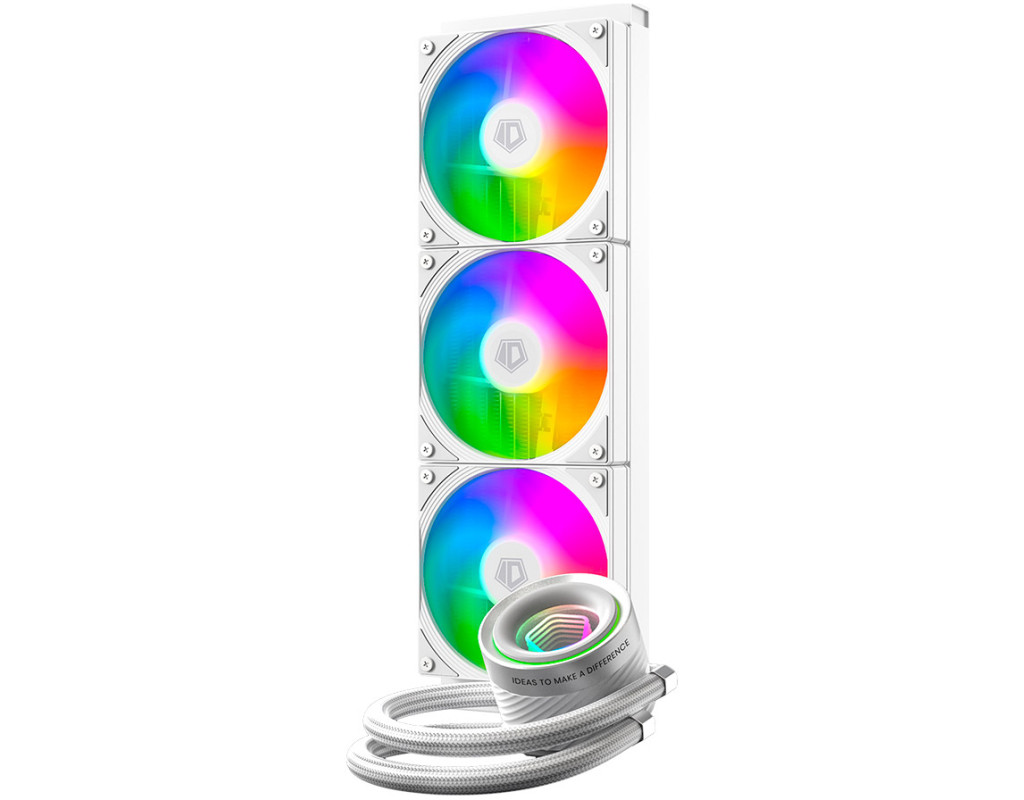ID-COOLING FX360 INF WHITE — ефективна система рідинного охолодження, призначена для відведення тепла від процесора та охолодження інших компонентів материнської плати. Оснащена великим радіатором з трьома вентиляторами, що забезпечує чудову ефективність охолодження та низький рівень шуму. Підтримує установку в будь-якій орієнтації завдяки обертовому колектору помпи. СРО має потужність розсіювання тепла 350 Вт і оснащена спеціально розробленим насосом Gen-7, який працює на максимальній швидкості 2900 об/хв. Ця помпа ефективно та тихо циркулює рідину для охолодження, забезпечуючи низькі температури навіть у періоди максимальної продуктивності ЦП. Три вентилятори AS-120 оснащені унікальними антивібраційними гумовими накладками на всіх чотирьох краях вентилятора, що забезпечують потужний повітряний потік та значно зменшують вібрацію. Вбудовані світлодіоди RGB випромінюють чарівні кольори та мають різні світлові ефекти, тому допоможуть оживити вашу систему та додати збірці яскравого акценту. FX360 INF оснащена потовщеними трубками високої щільності, зовнішня сторона яких обгорнута багатожильним міцним нейлоном. Вони створені, щоб протистояти розтягуванню, згинанню або пошкодженню трубок для захисту від протікання та випаровування рідини, що охолоджує. Має міцну раму та лопаті вентилятора, що спричиняє кращу продуктивність та подовжує термін служби компонентів. |
