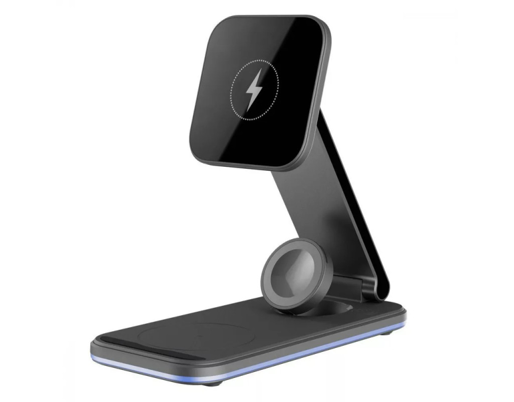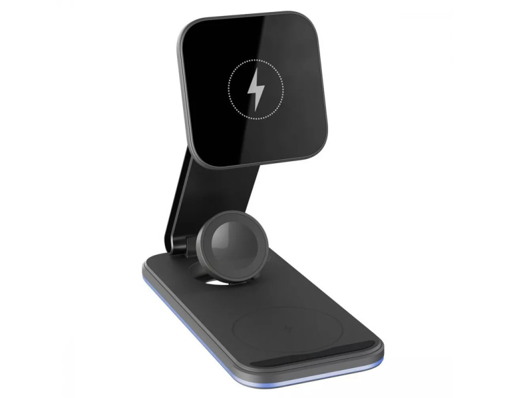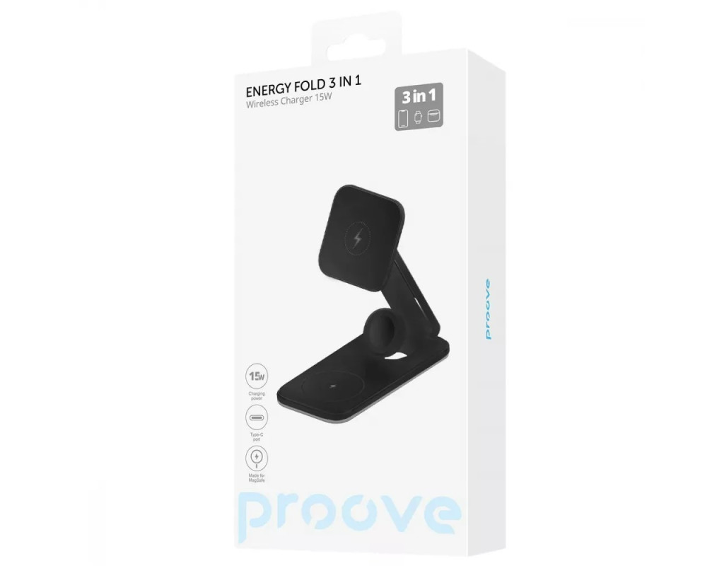 | Energy Fold 3 in 1 допоможе зарядити відразу три різні пристрої без втрати потужності. Гаджет має 3 різні точки контакту: для годинника, навушників і смартфона, компактно розміщених і не заважають один одному.