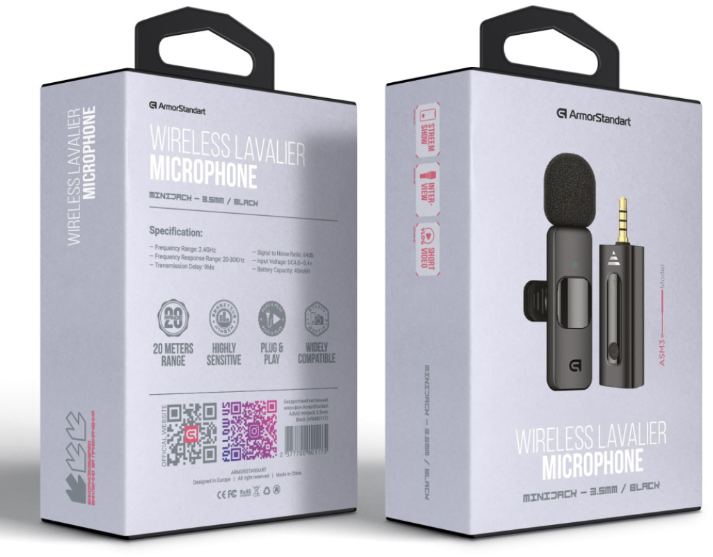 Бездротовий петличний мікрофон ArmorStandart ASM3 minijack 3.5mm Black — це зручне рішення для запису голосу з високою якістю звучання. Він ідеально підходить для блогерів, журналістів, викладачів і стрімерів, забезпечуючи чітку передачу звуку без перешкод і спотворень. Мікрофон працює на частоті 2.4 ГГц, що гарантує стабільний бездротовий зв’язок із низькою затримкою (9 мс), завдяки чому звук залишається синхронним із відео. Частотний діапазон 20 Гц – 30 кГц дозволяє передавати голос природно й чисто. Конструкція мікрофона передбачає захист від вітру, що робить його ефективним для використання на відкритому повітрі. Надійна фіксація на одязі забезпечує комфорт під час запису, а компактний аудіоприймач із роз'ємом 3.5 мм mini-jack легко підключається до сумісних пристроїв без необхідності встановлення додаткового програмного забезпечення. Обидва компоненти — мікрофон і приймач — мають вбудовані акумулятори. Заряду батареї вистачає до 3 годин безперервної роботи, а радіус дії в умовах без перешкод становить 15–20 метрів. Важливо враховувати, що приймач не можна заряджати під час використання. |