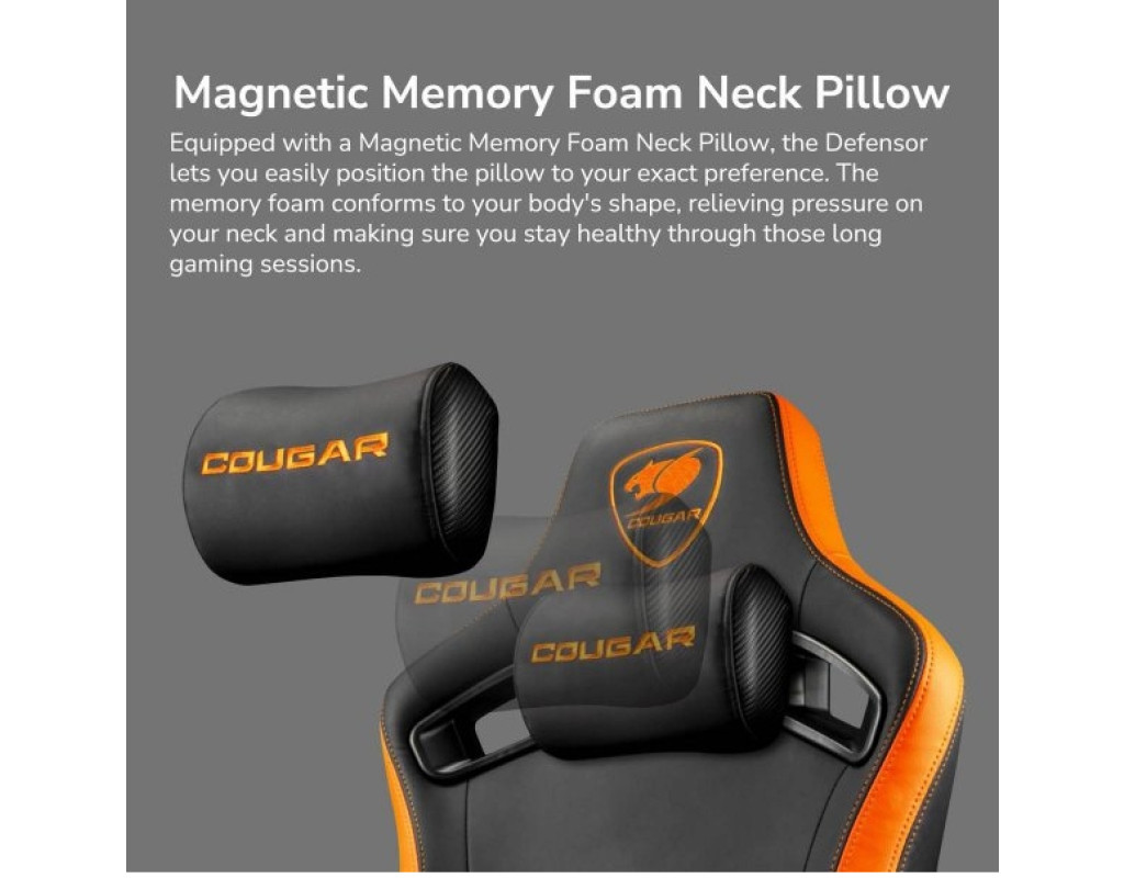 Підтримка PushBack Система підтримки попереку PushBack Advanced допомагає підтримувати природний лордотичний вигин поперекового відділу хребта. Інтегрована безпосередньо в Defensor, вона дозволяє вам точно регулювати тиск, що застосовується до попереку, зменшуючи навантаження на хребет та сприяючи правильному ортопедичному вирівнюванню. Магнітна подушка для шиї з піни з ефектом пам'яті Оснащений магнітною подушкою для шиї, Defensor дозволяє легко розташувати її відповідно до ваших уподобань. Піна з ефектом пам'яті набуває форми вашого тіла, знімаючи напругу з шиї та гарантуючи комфорт навіть під час довгих ігрових сесій. Формована піна високої щільності Формована піна високої щільності з часом точно повторює форму вашої спини, забезпечуючи неперевершений комфорт та надійну підтримку. Складані 4D-підлокітники Спочатку розроблені для офіційного ігрового крісла Cougar x VCT 2024 і ретельно протестовані на кіберспортивній арені, складані 4D-підлокітники: