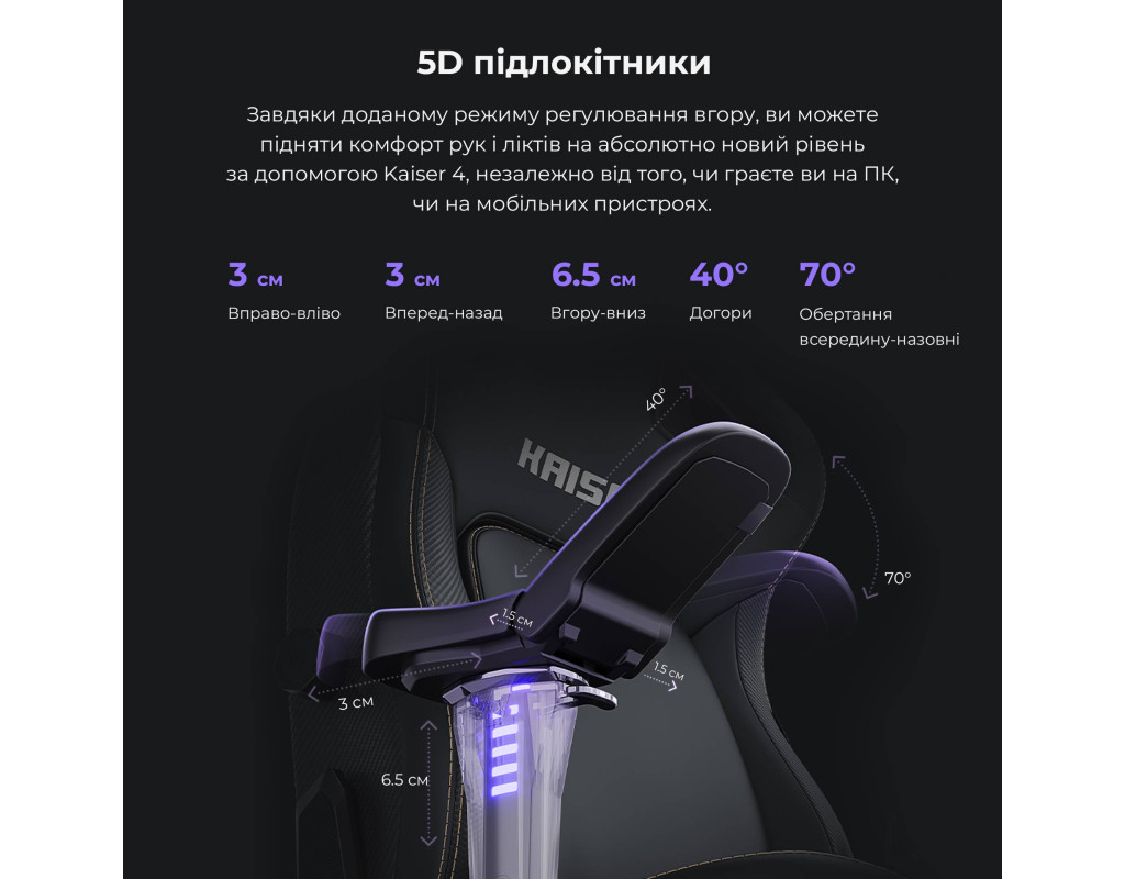4-позиційне вбудоване регулювання. Нова вбудована система поперекової підтримки розроблена із простішою та гнучкішою можливістю регулювання. Вона забезпечує індивідуальну підтримку та комфорт поперекової частини спини, дозволяючи отримати природний і здоровий вигин хребта в кожній позі для сидіння. За допомогою швидкого натискання на важіль ви можете підібрати зручну позицію спинки крісла для максимальної підтримки. Спинка вільно реагує на ваші рухи, коли розблокована, і забезпечує міцну підтримку, коли вона у заблокованому положенні. Комфорт у всіх позах Незалежно від того, граєте ви, чи працюєте, ви завжди можете відрегулювати поперекову підтримку відповідно до свої потреб. Надійна стійкість до плям Покриття Kaiser 4 має надзвичайну властивість стійкості до плям. Завдяки захисному шару, його шкіра не дає плямам в’їдатися. Тож ви можете швидко очистити каву, крихти від закусок або відбитки домашніх улюбленців за допомогою вологої серветки. Для більш стійких плям підійде спиртовий спрей і серветка. Надзвичайна довговічність Завдяки перевіреній та схваленій стійкості до стирання, матеріал покриття розрахований на всі види використання. Вона створена для протистояння вицвітанню кольору під впливом ультрафіолету рівня 4 або вище, забезпечуючи гладку поверхню крісла, яка не зношується з кожним наступним використанням. 2000 Цикл випробування на стирання за Табером. 2000 Тест на стирання за Мартиндейлом Створено з турботою про планету та вас Шкіряний матеріал Kaiser 4 відповідає стандартам OEKO-TEX та RoHS. Забезпечує здорове сидіння. Магнітна подушка для шиї Прикріпіть подушку для шиї в будь-якому зручному для вас положенні за допомогою магнітної фіксації. Подушка містить пружну, еластичну піну з ефектом пам’яті , яка природним чином приймає форму голови та шиї. Крім того, завдяки охолоджувальному шару, вона зберігає вашу шию прохолодною навіть під час гарячих ігрових моментів 5D підлокітники Завдяки доданому режиму регулювання вгору, ви можете підняти комфорт рук і ліктів на абсолютно новий рівень за допомогою Kaiser 4, незалежно від того, чи граєте ви на ПК, чи на мобільних пристроях. Ергономічне сидіння з піною Memory foam Широке і глибоке сидіння підняте на 5° вгору, щоб сприяти більш прямому і здоровому положенню хребта. Піна високої щільності зменшує тиск на нижні кінцівки і зберігає форму навіть після багатьох років використання. Відкиньтеся на спинку сидіння і відпочивайте так, як вам подобається. Завдяки міцній конструкції та посиленій колісній базі, Kaiser 4 завжди прикриє вашу спину. 30° Режим гойдання Гойдайтеся з максимальним комфортом. Надміцний механізм нахилу забезпечує стабільне гойдання в будь-якій позі. 8 см Плавне налаштування висоти Завдяки газ-ліфту 4-го класу, сертифікованого SGS, можна без особливих зусиль отримати ідеальну висоту для ніг. |