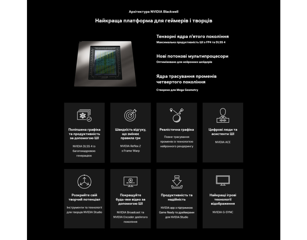 Висока продуктивність та підтримка сучасних технологій Завдяки 10752 ядрам CUDA та 16 ГБ пам'яті GDDR7 з швидкістю 30 Гбіт/с, відеокарта забезпечує високу продуктивність для ігор та створення контенту. Підтримка технологій NVIDIA DLSS 4 з багатокадровою генерацією, повного трасування променів з нейронним рендерингом та NVIDIA Reflex 2 з Frame Warp забезпечує покращену графіку, швидкий відгук та реалістичні візуальні ефекти.