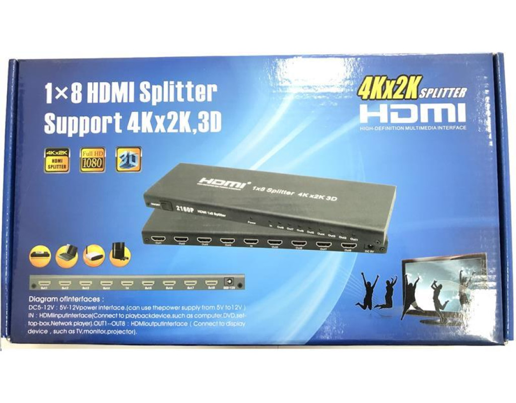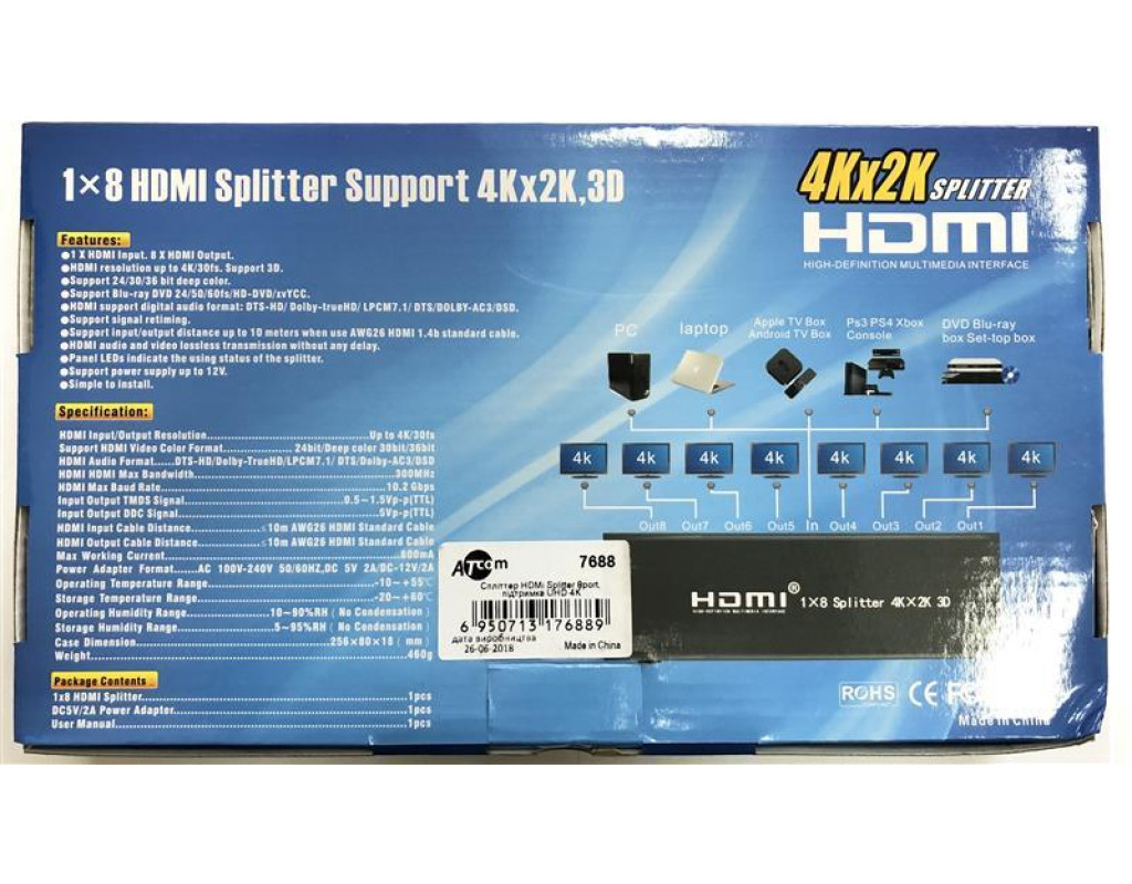 | Спліттер HDMI 1х4 Ultra HD (4Кх2К, 3D) ATcom це розгалужувач hdmi 1 вхід і 8 виходів, який розділяє цифровий сигнал HDMI з одного джерела (BlueRay, ноутбук, ресивер, плеєр, ігрова консоль) на два приймача у вигляді ТВ-дисплея (телевізор, панель, проектор) одночасно.