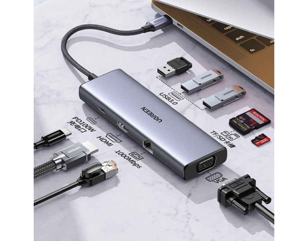 Хаб Ugreen 10 в 1 USB C забезпечує розширений подвійний монітор 4K HDMI і 1080P VGA, порт Gigabit Ethernet, порт зарядки USB C 100 Вт PD, 3 порти USB A 3.0 і пристрій читання карт SD TF. Усі порти багатопортового адаптера можна використовувати одночасно.
