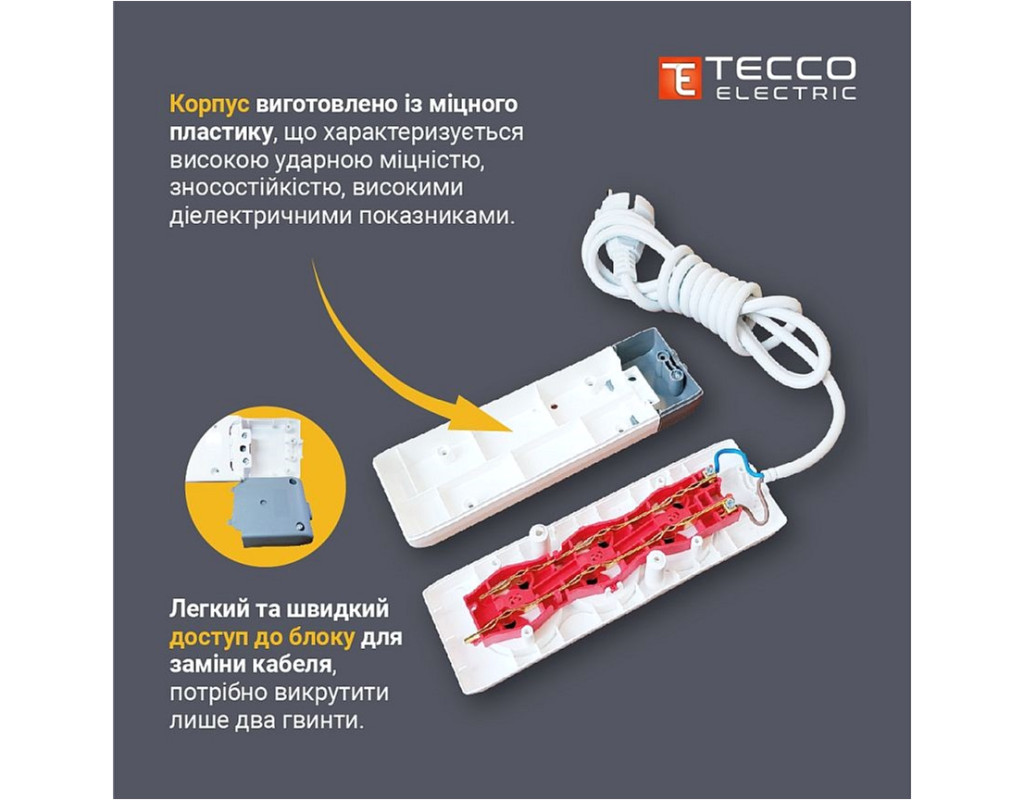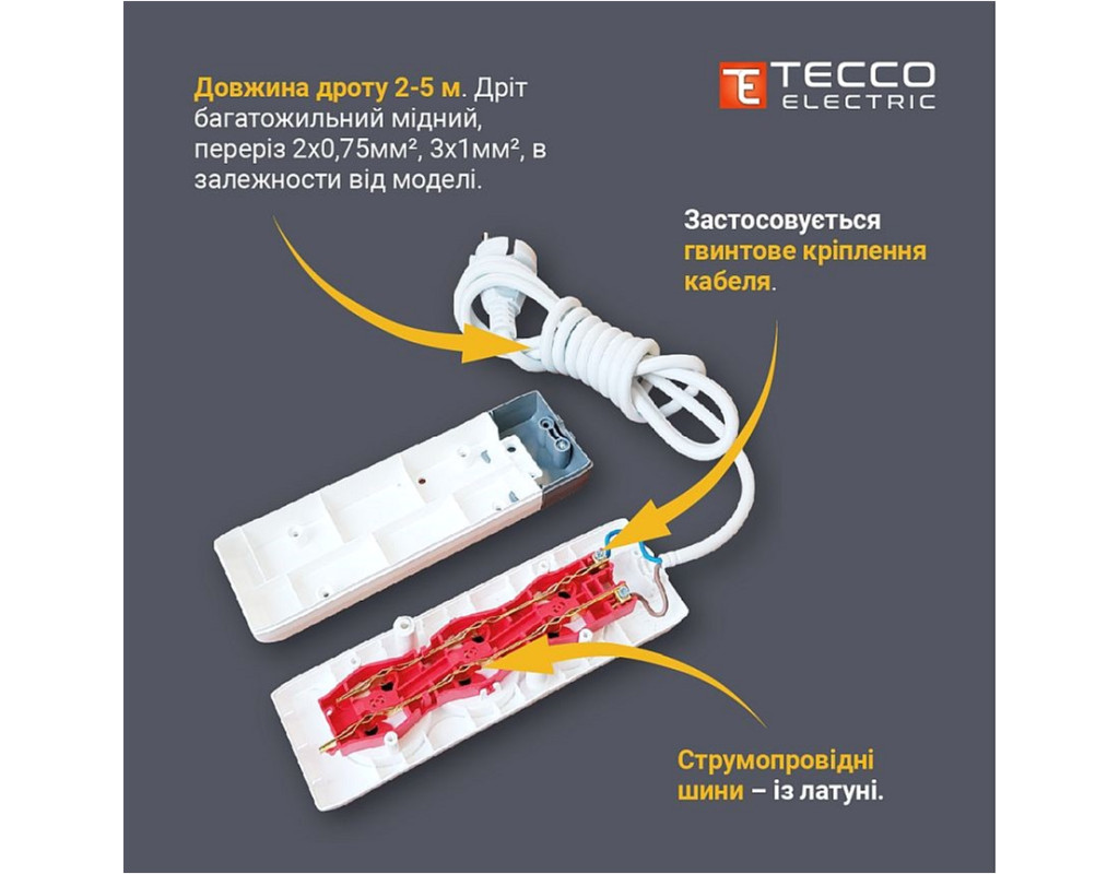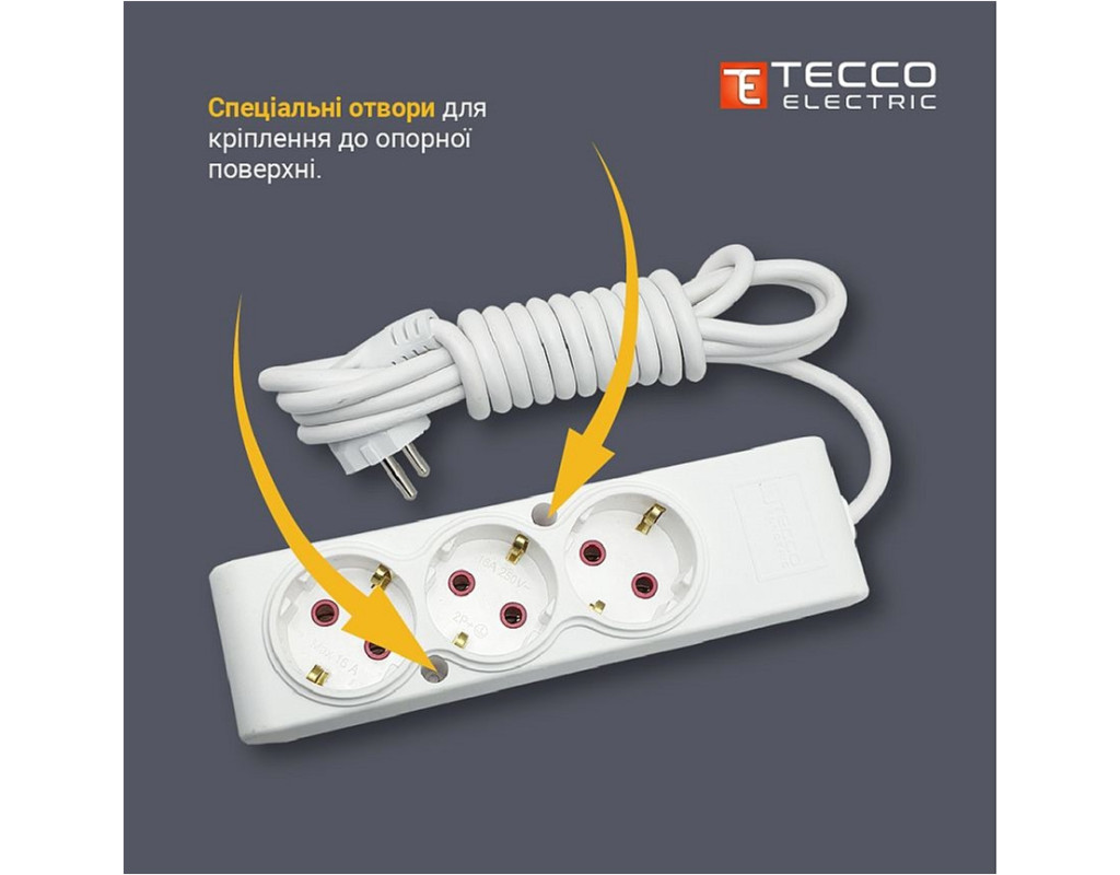 Подовжувачі TECCO призначені для одночасного підключення до мережі різноманітних приладів - це оптимальний вибір для забезпечення надійного контакту, захисту від дотику до струмопровідних шин, надійної та безперебійної роботи з електричною мережею. Призначені для внутрішніх мереж змінного струму, напругою до 250В – побутова та офісна техніка, професійний та побутовий електроінструмент, освітлювальні прилади тощо. Корпус виготовлений з міцного поліпропілену, що характеризується високою ударною міцністю, зносостійкістю, високими діелектричними показниками. виріб від перегріву та термічної руйнації в аварійних ситуаціях. Струмопровідні шини - з латуні. Застосовується гвинтове кріплення кабелю.