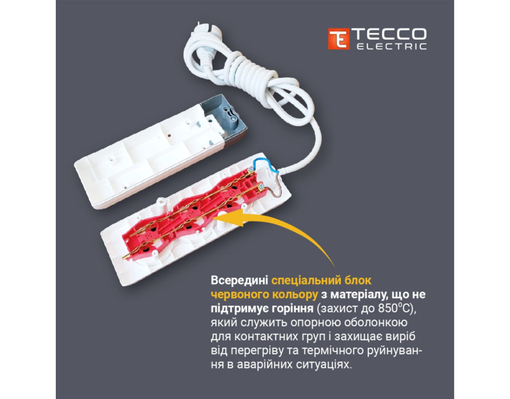 Подовжувачі TECCO призначені для одночасного під'єднання до електромережі різних приладів — це оптимальний вибір для забезпечення надійного контакту захисту від дотику до струмопровідних шин, надійної та безперебійної роботи з електричною мережею. Призначені для внутрішніх мереж змінного струму, напругою до 250 В — побутова та офісна техніка, професійний і побутовий електроінструмент, світильники та ін. Корпус виготовлений із міцного поліпропілену, характеризується високою ударною міцністю, зносостійкістю, високими діелектричними показниками. Усередині спеціальний блок червоного кольору з матеріалу, що не підтримує горіння (захист 850⁰С), який слугує опорною оболонкою для груп і захищає виріб від перегрівання і термічного руйнування в аварійних ситуаціях. Струмопровідні шини — з латуні. Застосовується гвинтове кріплення кабелю. |