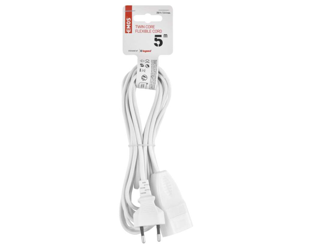 Кількість розеток - 1, євророзетка без заземлення (Тип С), Довжина кабелю - 5 м, з плоскою вилкою, Захист - IP20, Сумарна потужність підключеного навантаження - ≤ 575 Вт, Колір - білий