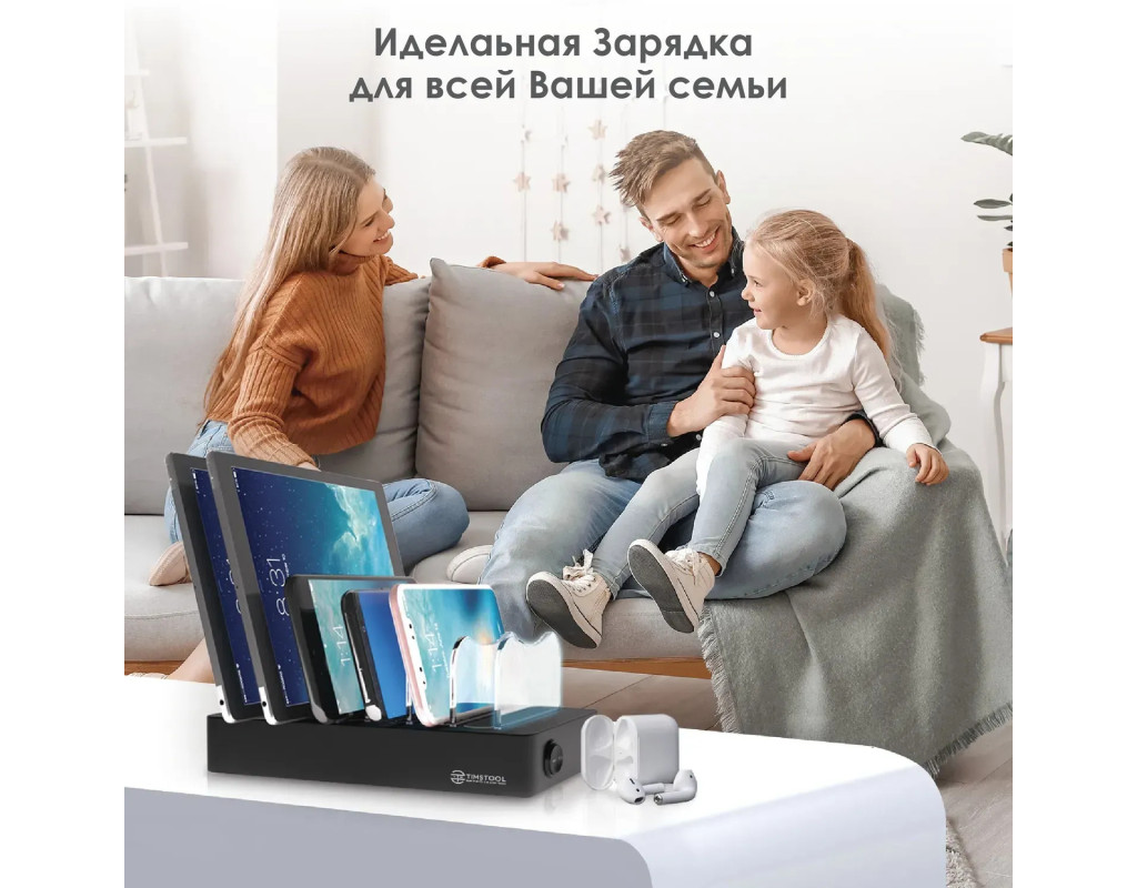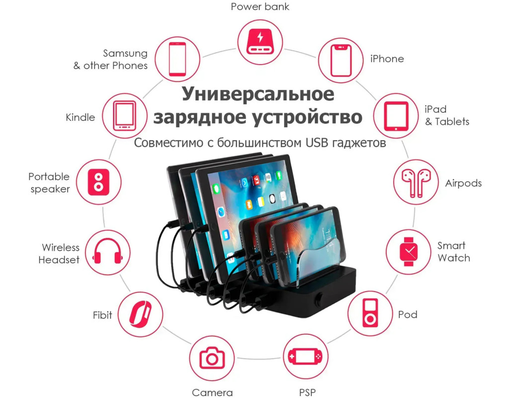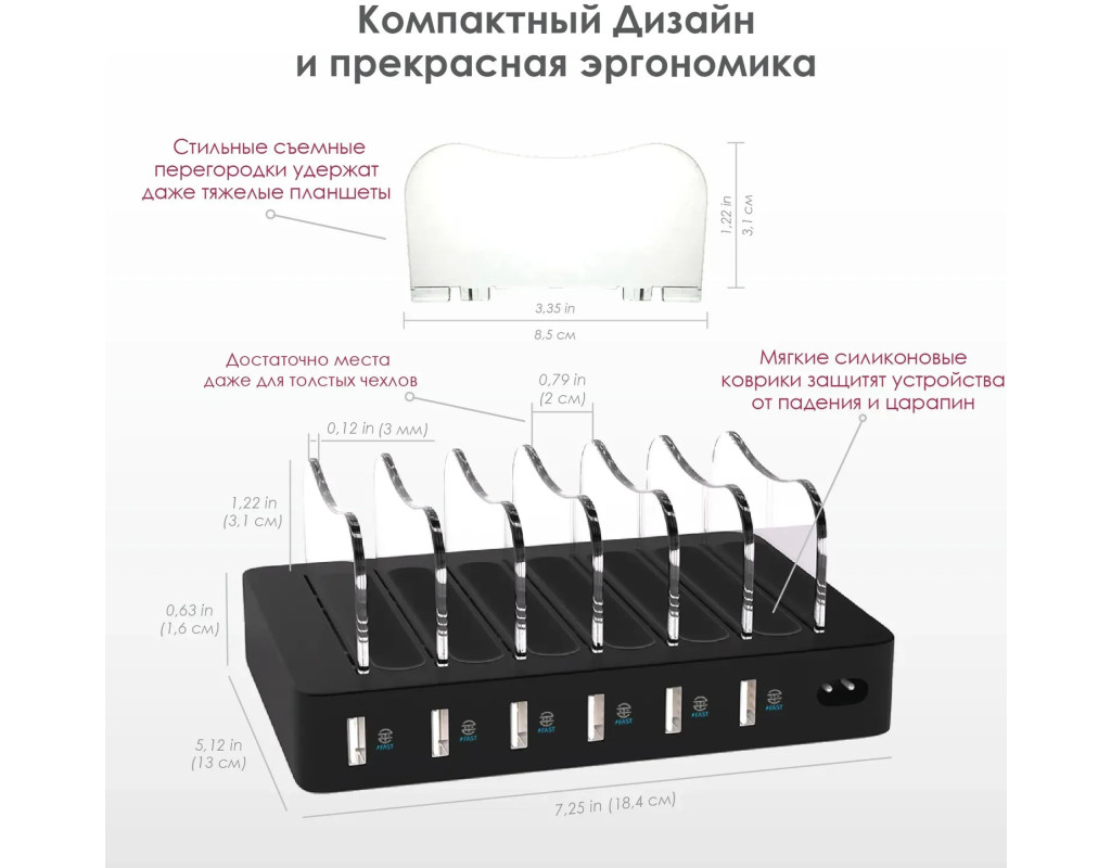 Зручний зарядний стенд для телефона і органайзер для кабелів і зарядок - настільна зарядна станція для телефона виконана в лаконічному дизайні, що ідеально впишеться в будь-який інтер'єр і дозволить заряджати всі пристрої разом. А 7 міцних опор, допоможуть впорядковано розмістити усі девайси Кожна опора -з’ємна, що дозволяє змінювати відстань між слотами, якщо на зарядний хаб необхідно розмістити громіздкі пристрої для зарядки Сама багатопортова зарядка органайзер для телефонів має м'які силіконові килимки між перегородками мульти зарядки, які захищають ваші пристрої від подряпин і не дають їм впасти з бази для зарядки гаджетів Варто купити зарядну станцію для дому якщо вам потрібен автоматичний зарядний пристрій для квартири - універсальна usb зарядка для кафе – розумний зарядний пристрій в приймальню чи в офіс - або ви хочете купити зарядне до телефона на ресепшн, чи універсальний зарядний пристрій органайзер в спортзал і фітнес-клуб