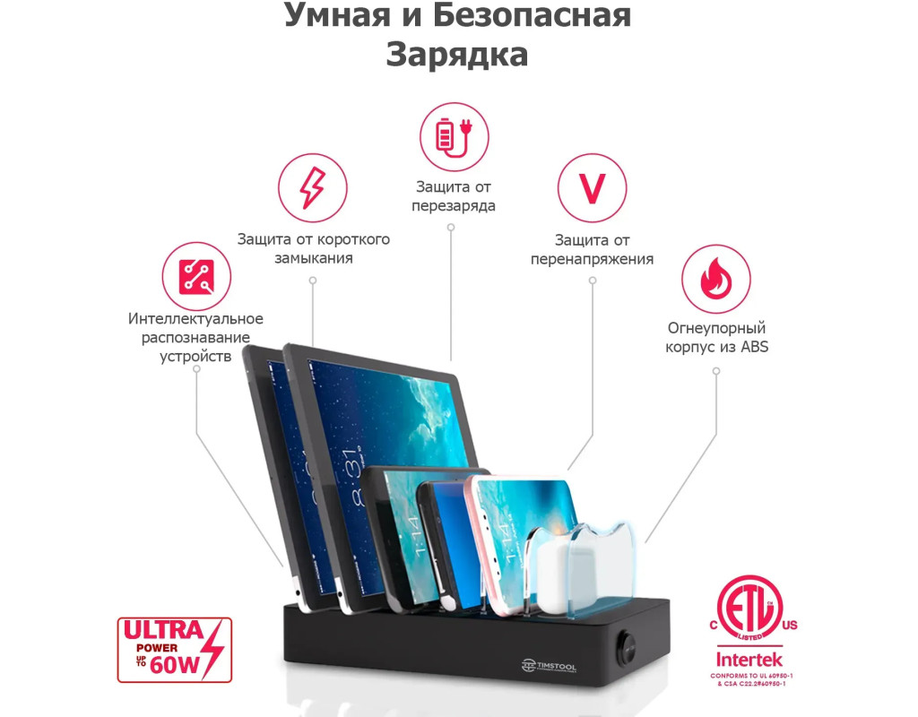 Безпека і Захист ваших пристроїв - універсальне мульти зарядне для телефонів має кілька рівнів безпеки. Вона дозволяє швидко зарядити декілька пристроїв одночасно, захищаючи їх від перевантажень, перезаряду і короткого замикання. Сам же швидкий зарядний стенд для смартфонів і гаджетів зроблений з вогнетривкого ABS матеріалу і пропонує кращу безпеку при нештатних ситуаціях.
