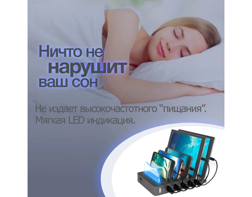 Абсолютно Безшумна Робота: ніщо не потривожить ваш сон - інтелектуальний зарядний пристрій для мобільних телефонів від TIMSTOOL допоможе насолодитися сном і відпочинком у повному спокої і тиші. На відміну від багатьох зарядних, універсальна док станція для зарядки телефонів – планшетів - гарнітур не продукує неприємного високочастотного дзижчання\писку, і може використовуватися як нічне зарядне для смартфона на вашій тумбочці біля ліжка..