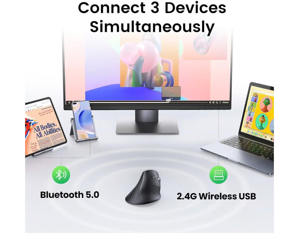 Ugreen MU008 — це сучасна вертикальна миша, створена для тих, хто цінує комфорт і функціональність у роботі чи повсякденному використанні. Її унікальний дизайн допомагає зменшити навантаження на зап'ястя та передпліччя, забезпечуючи природне положення руки навіть під час тривалого використання. Ця мишка оснащена високоточним оптичним сенсором із чотирма рівнями роздільної здатності — 1000, 1600, 2400 та 4000 DPI. Ця функція дозволяє налаштовувати чутливість миші залежно від ваших потреб. Перемикання DPI здійснюється одним натисканням кнопки, що забезпечує зручність і універсальність. Ugreen MU008 дозволяє встановлювати бездротове з’єднання з трьома пристроями. Bluetooth 5.0 забезпечує підключення до двох пристроїв, наприклад, ноутбука і планшета. USB-приймач 2.4 ГГц надає можливість підключення ще одного пристрою, як-от настільного ПК. Переключення між пристроями здійснюється швидко і без затримок, що робить мишу ідеальною для багатозадачності. Безшумні перемикачі забезпечують тиху роботу миші, дозволяючи використовувати її в офісі, вдома або навіть уночі, не створюючи зайвого шуму для оточуючих. Завдяки бездротовому підключенню миша допомагає позбутися плутанини кабелів на робочому столі, зберігаючи його охайним і акуратним. |