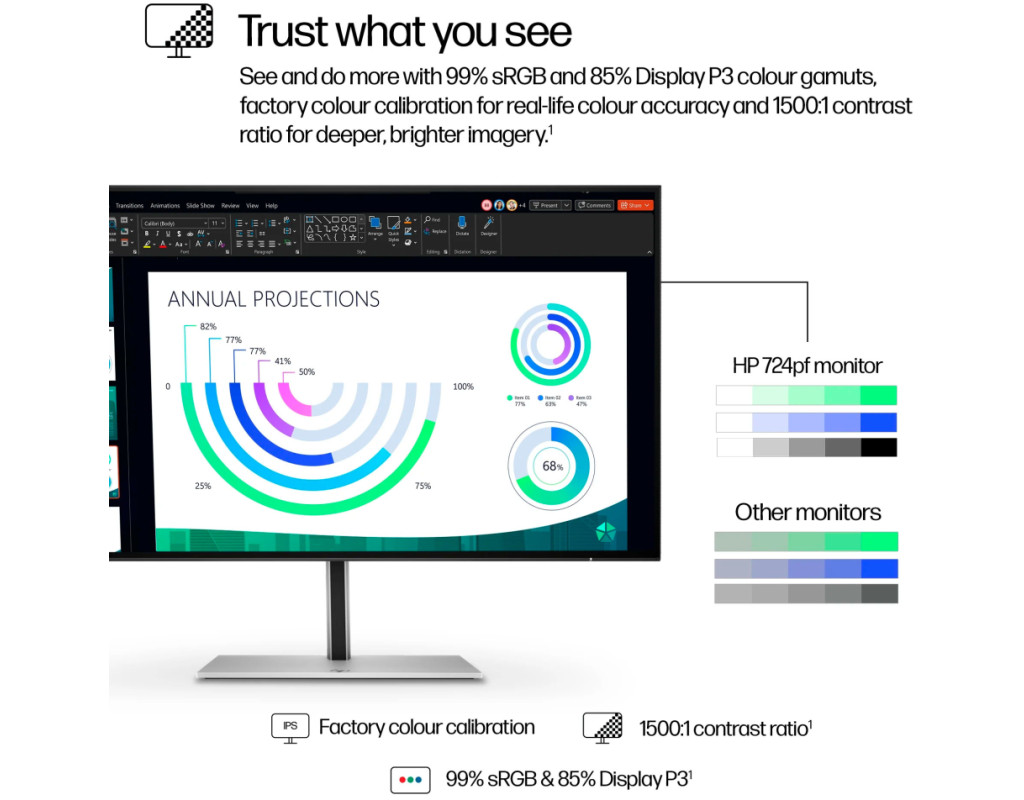 Реалістичне зображення Погляньте, як ваш доробок набуває абсолютно нового виміру на великому чіткому екрані з яскравими й точними кольорами, що доступні відразу з моменту встановлення. Кожна деталь чітко виділяється завдяки глибшим тіням і яскравішим світлим ділянкам, які забезпечує коефіцієнт контрастності 1500:1 Монітор проходить заводське калібрування кольорів і має колірні гами 99% sRBG і 85% Display P3, тож чудова, реалістична точність відтворення кольорів, яка залишається незмінною від екрана до екрана. Мінімалізм у дизайні, максималізм у функціях Цей монітор із продуманим дизайном преміум-класу покращує ваше робоче життя та виділяється на робочому столі завдяки своєму надзвичайно тонкому корпусу й оптимізованим можливостям підключення. Такий елегантний монітор з 4-сторонньою рамкою з мікрокантами й ультратонким корпусом виглядає чудово на будь-якому робочому місці. Додайте до цього максимальне підвищення продуктивності за рахунок можливості використання двох екранів за допомогою простого послідовного підключення. Зручно, як не крути Обертайте по вертикалі. Нахиляйте по горизонталі. Цей монітор не лише допоможе вам робити більше протягом дня, а й забезпечить краще самопочуття й вищий рівень комфорту. Перегляд інформації на екрані буде комфортним завдяки частоті оновлення 100 Гц, що забезпечує плавне прокручування й відтворення відео, а вбудована технологія HP Eye Ease, яка зменшує випромінювання синього світла, допоможе зосередитися, зберігаючи водночас реалістичну точність передачі кольорів. Налаштуйте монітор так, як вам зручно, завдяки можливості ергономічного регулювання чотирма способами: змінення висоти підставки (у межах 150 мм), а також нахилу й повороту в горизонтальній і вертикальній площинах. Візуально ефектний Частота оновлення 100 Гц Переглядайте плавні реалістичні відео з вражаючою деталізацією. Вища контрастність Зображення має більше градацій кольорів, тіней і світлих ділянок завдяки покращеному коефіцієнту контрастності 1500:1. Колірні гами 99% sRGB та 85% Display P3 Зображення на екрані вражає багатством кольорів і відтінків, яке забезпечують колірні гами 99% sRGB й 85% Display P3. Точна передача кольору на момент постачання Кожен монітор HP серії 7 Pro проходить суворе заводське калібрування кольорів. Це гарантує, що для понад 400 кольорів значення Дельта E є меншим ніж 2, завдяки чому різниця між кольорами практично непомітна для людського ока, що забезпечує виняткову точність передачі кольору. |